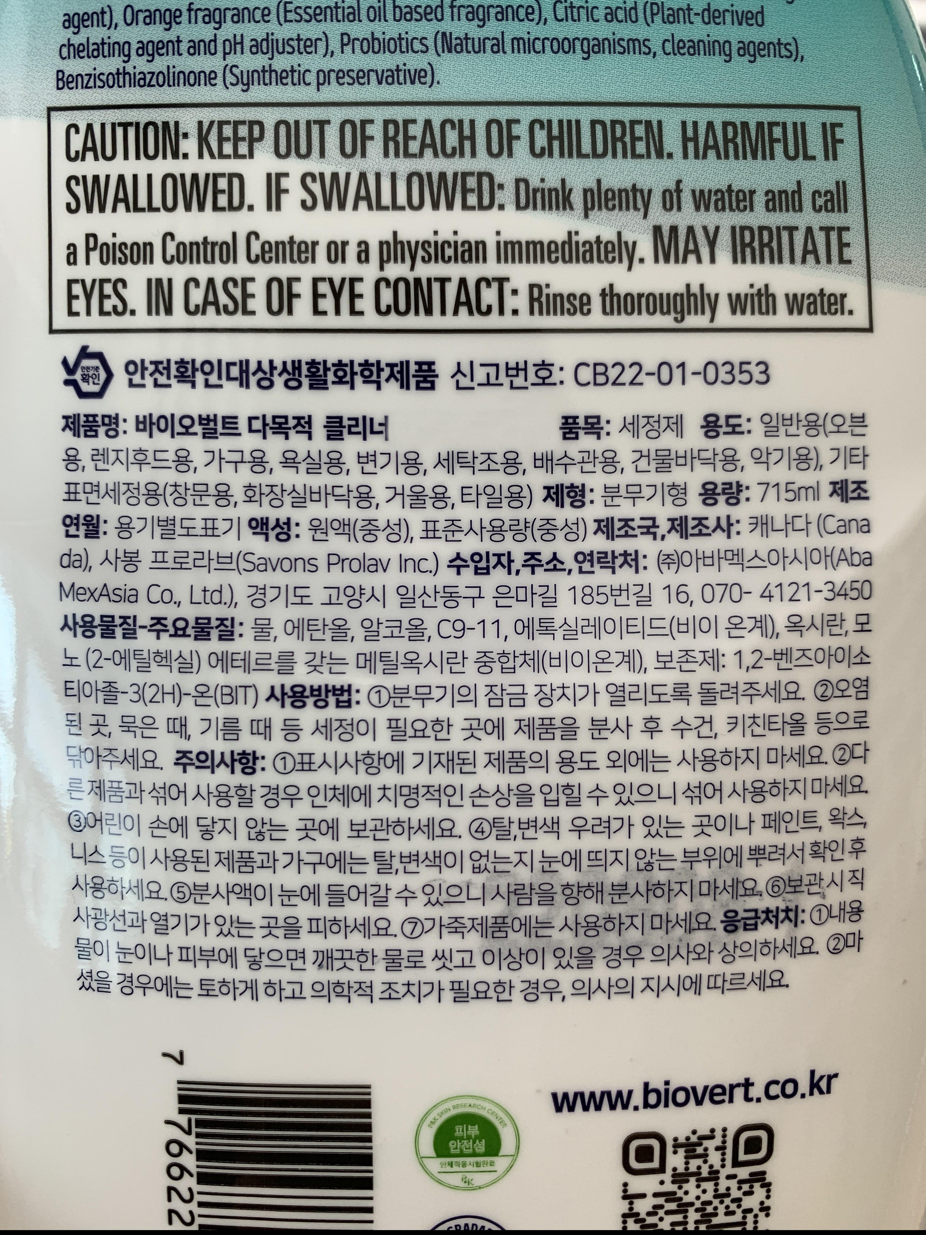 | 품목 및 제품명 | 세정제/바이오벌트 다목적 클리너 | 용도(표백제의 경우 계열을 함께표시) 및 제형 | 일반용-오븐용,일반용-렌지후드용,일반용-욕실용,일반용-변기용,일반용-세탁조용,일반용-배수관용,일반용-건물 바닥용,일반용-가구용,일반용-악기용,일반용-기타표면세정용-창문용, 화장실바닥용, 거울용, 타일용/분사형-분무기형 |