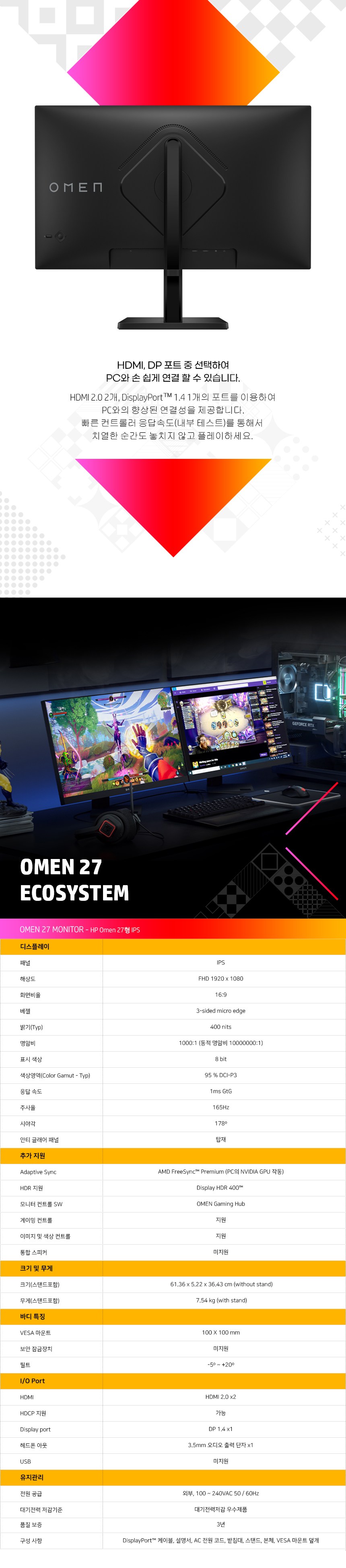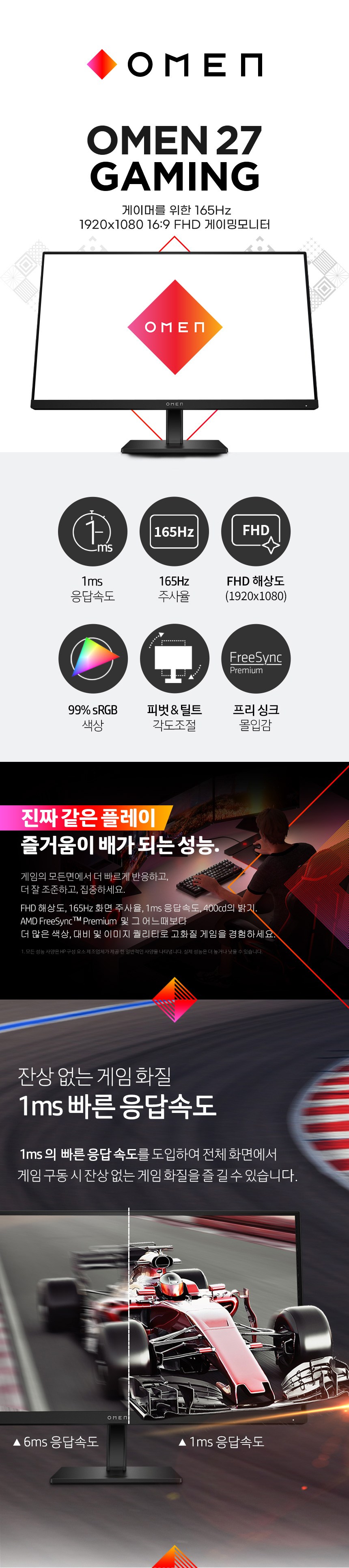 | 품명 및 모델명 | 모니터 OMEN 27 FHD 165Hz Gaming Monitor / HSD-0155-A | KC 인증정보 | R-R-hpi-HSD-0155-A, XU100626-23126A |