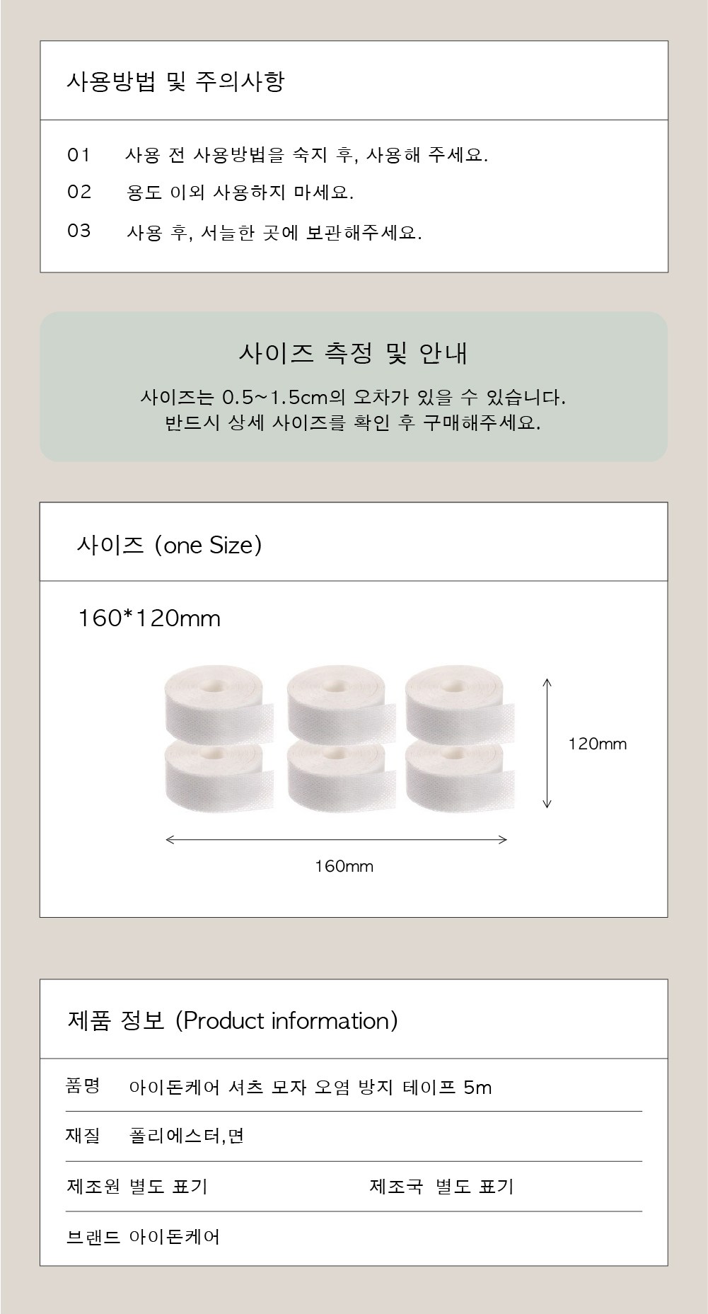 | 품명 및 모델명 | 아이돈케어 셔츠 모자 오염 방지 테이프 5m | 인증/허가 사항 | 해당없음 |