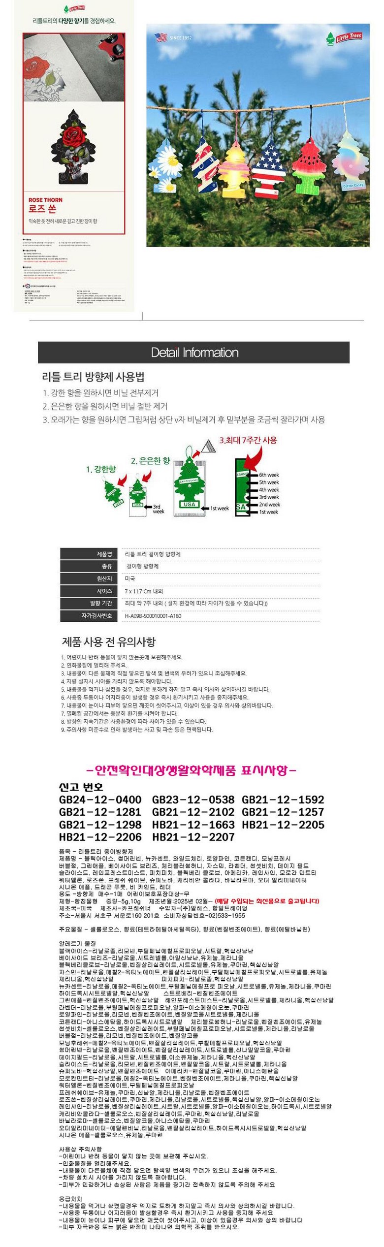 | 품목 및 제품명 | 품목: 방향제 / 제품명 : 리틀트리 방향제 | 용도(표백제의 경우 계열을 함께표시) 및 제형 | 용도: 자동차용(실내용),일반용(실내공간용) / 제형: 함침물형 |