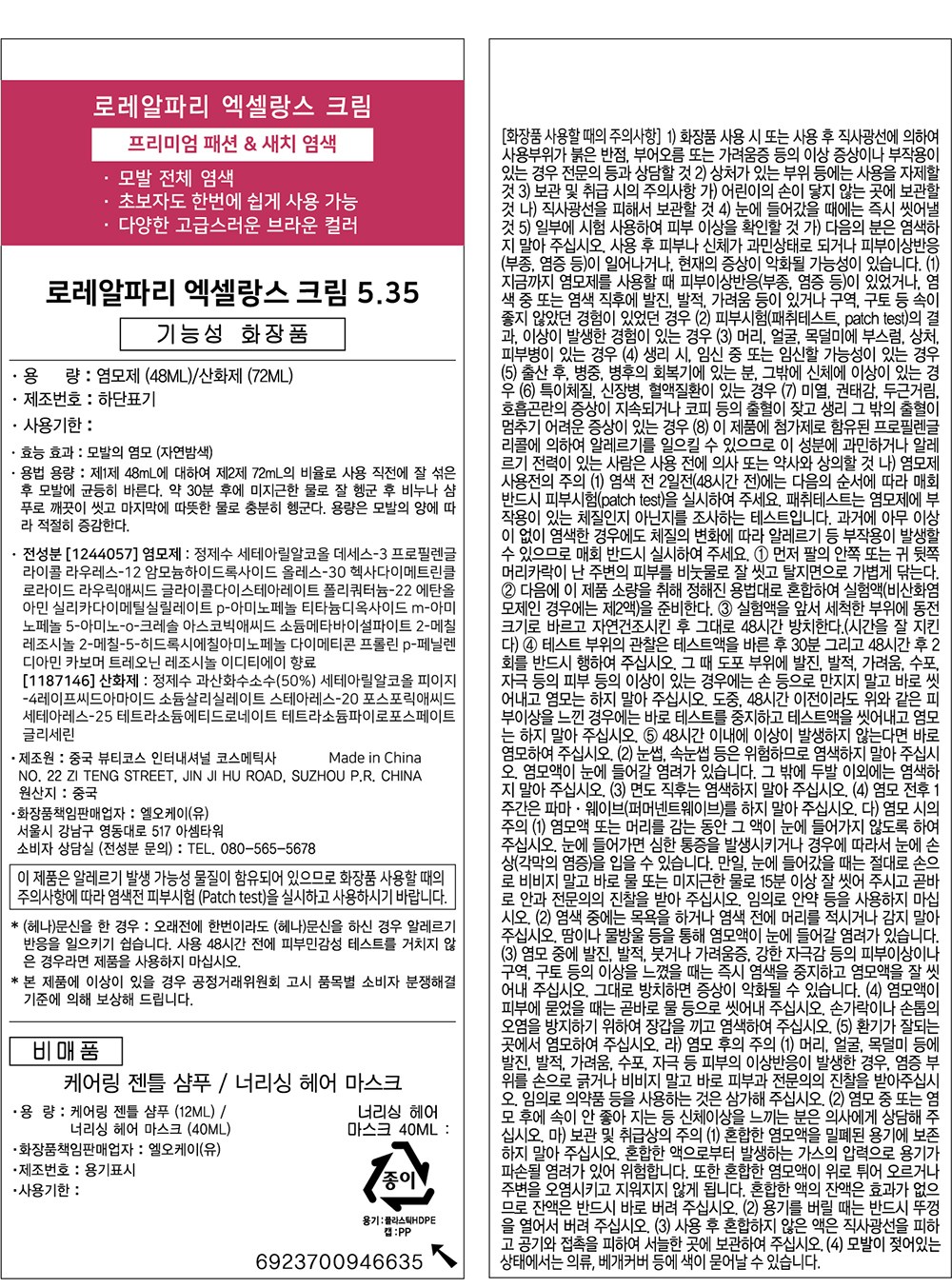 | 용량(중량) | 컨텐츠 참조 | 제품 주요 사양 | 모든 모발용 |