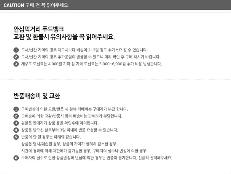 | 교환/반품 비용 (왕복비용) | 7,000원 - 단, 고객 변심의 경우에만 발생 - 도서산간 지역 배송불가 |