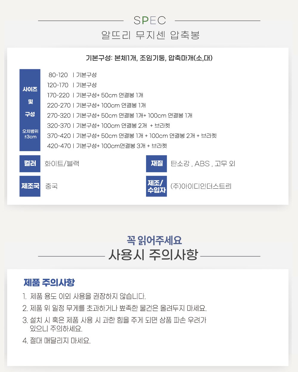 | 제조국(원산지) | 중국 | 제조자(수입자) | (주)아이디인더스트리 |