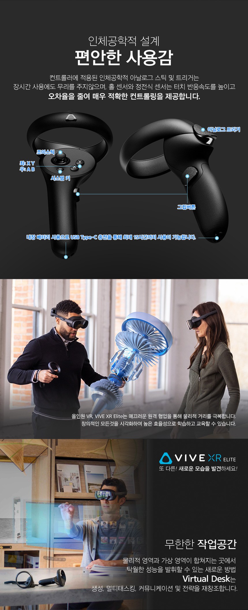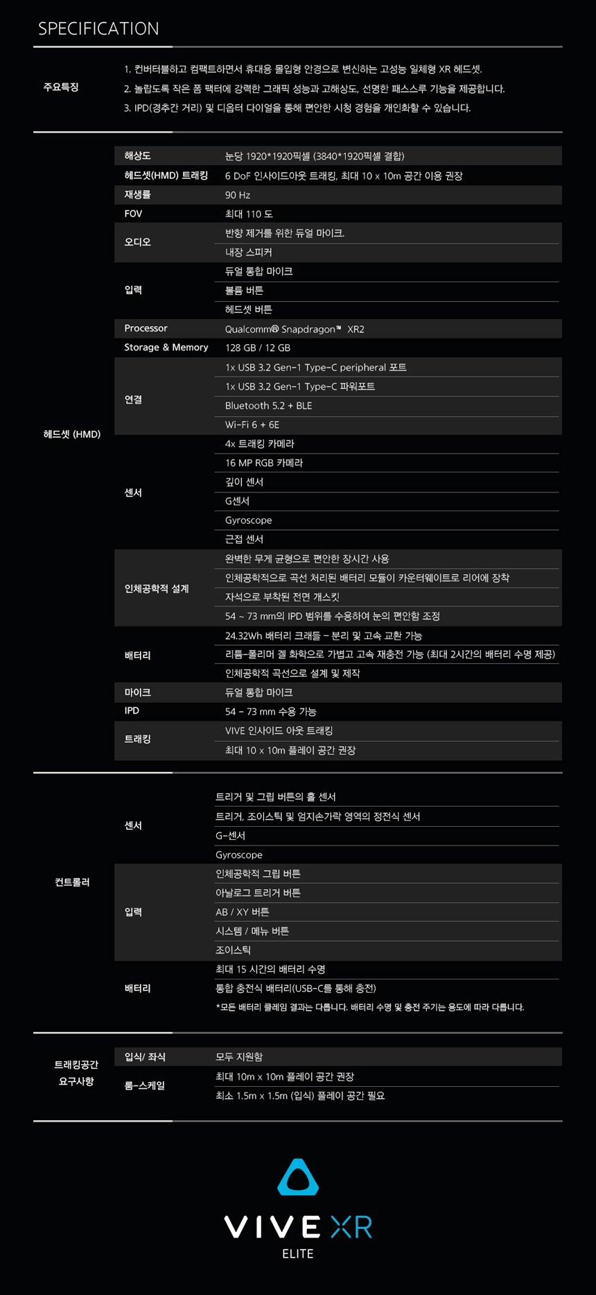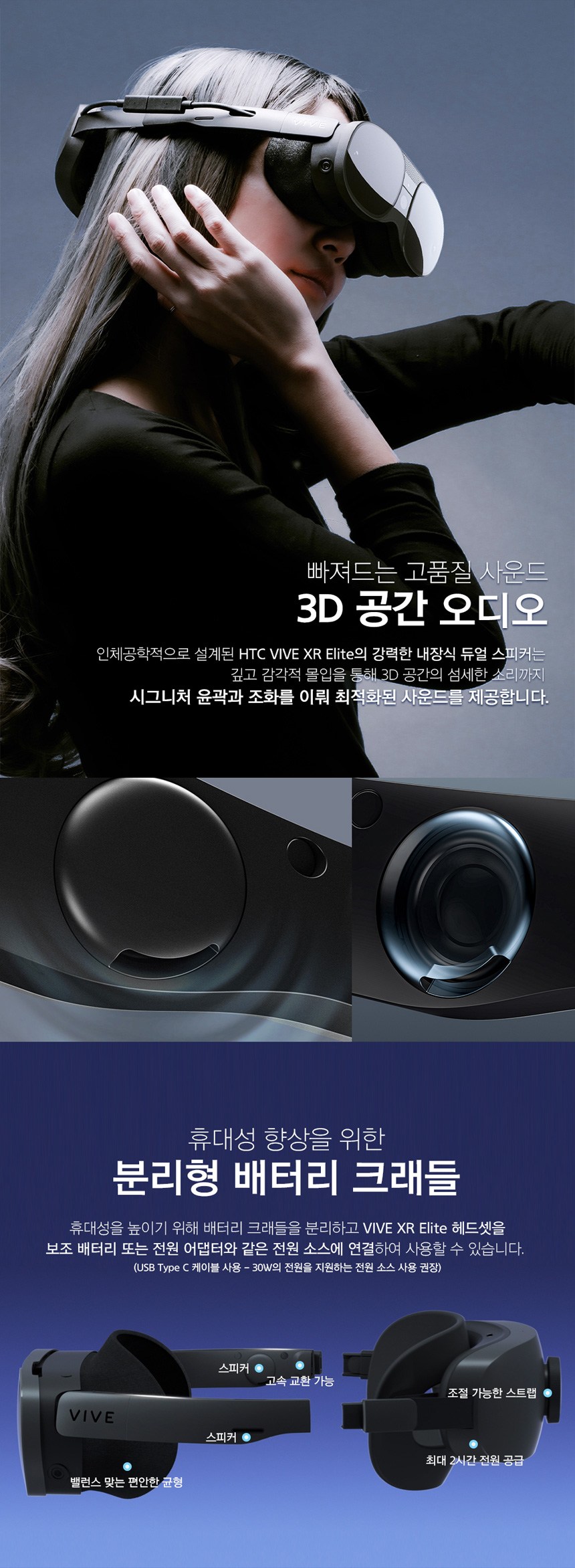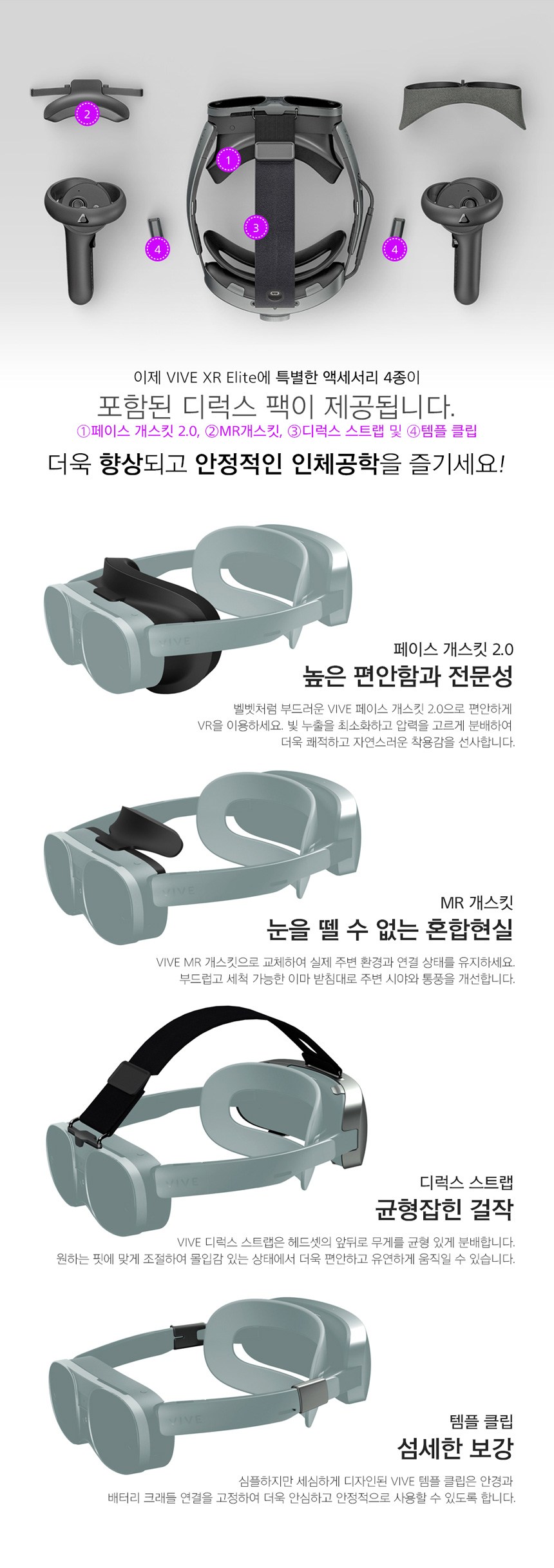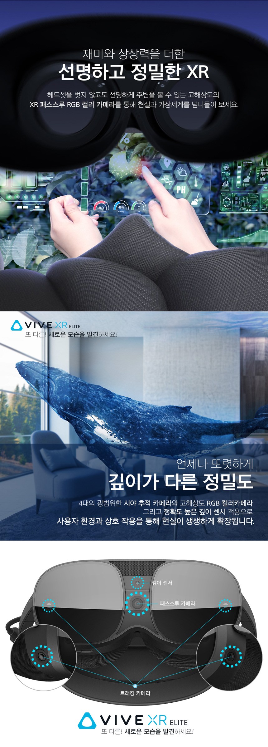 | 품명 및 모델명 | VIVE HTC XR Elite VR 세트 / 2QBB100 | KC 인증정보 | 본품 : R-C-HIG-2QBB100 / 컨트롤러(L) : R-R-HIG-2Q8R200 / 컨트롤러(R) : R-R-HIG-2Q8R100 / HMD 배터리 크레들 : R-R-HIG-2QBQ100, 전지: YU10408-22010 |