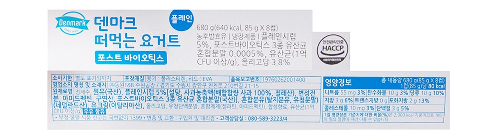 | 제품명 | 덴마크 떠먹는 요거트 포스트바이오틱스 플레인 | 식품의 유형 | 컨텐츠 참조 |