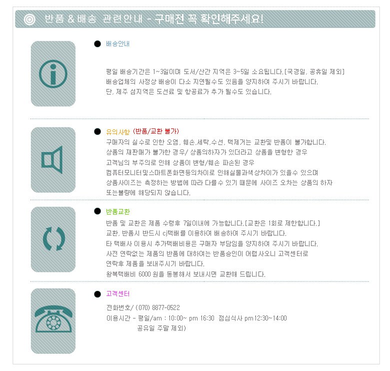 - ㆍ교환/반품에 관한 일반적인 사항은 판매자가 제시사항보다 관계법령이 우선합니다.