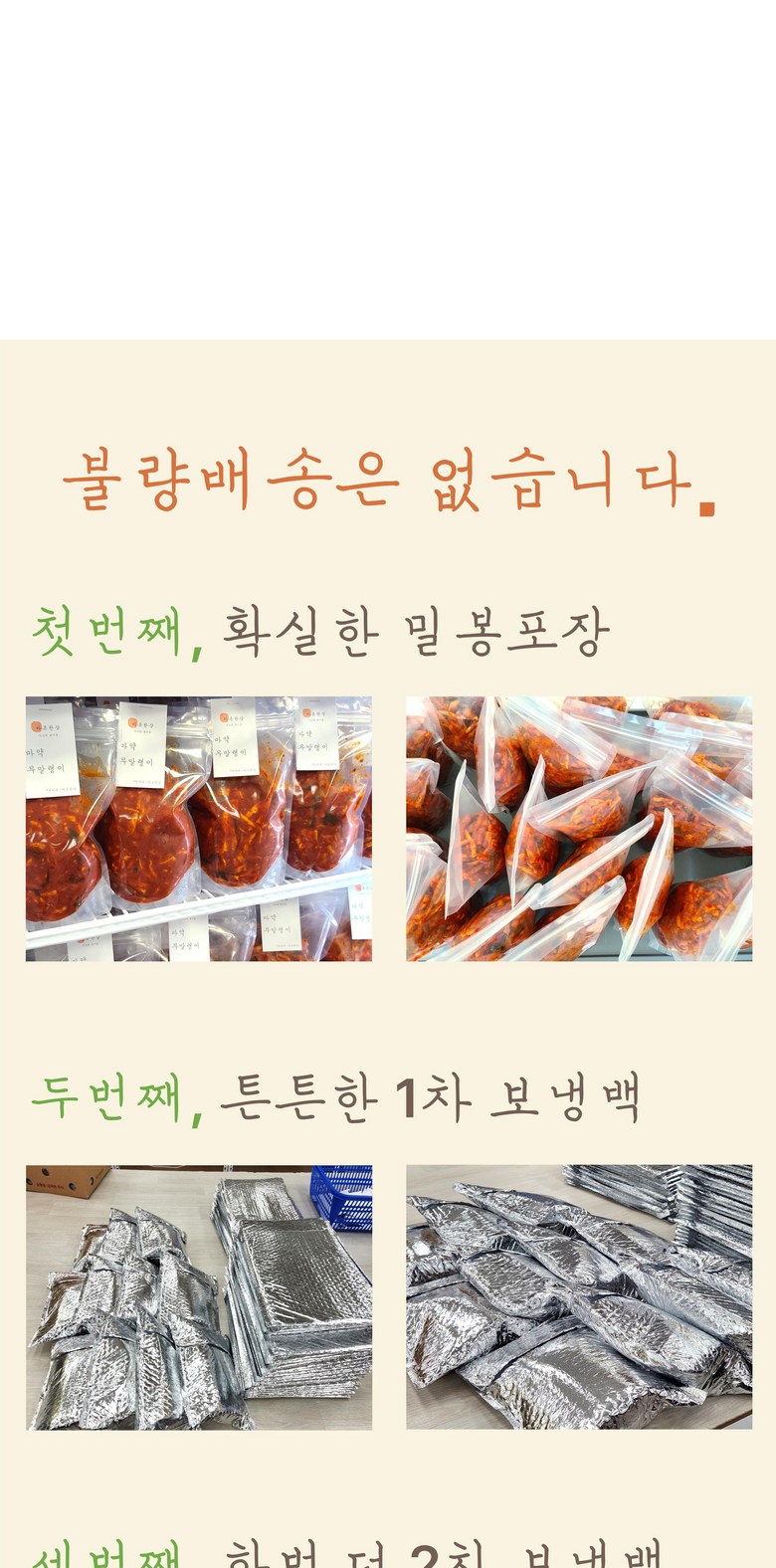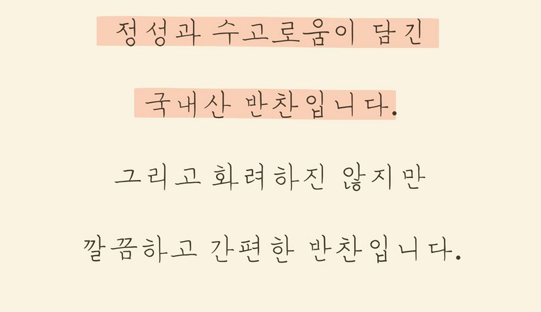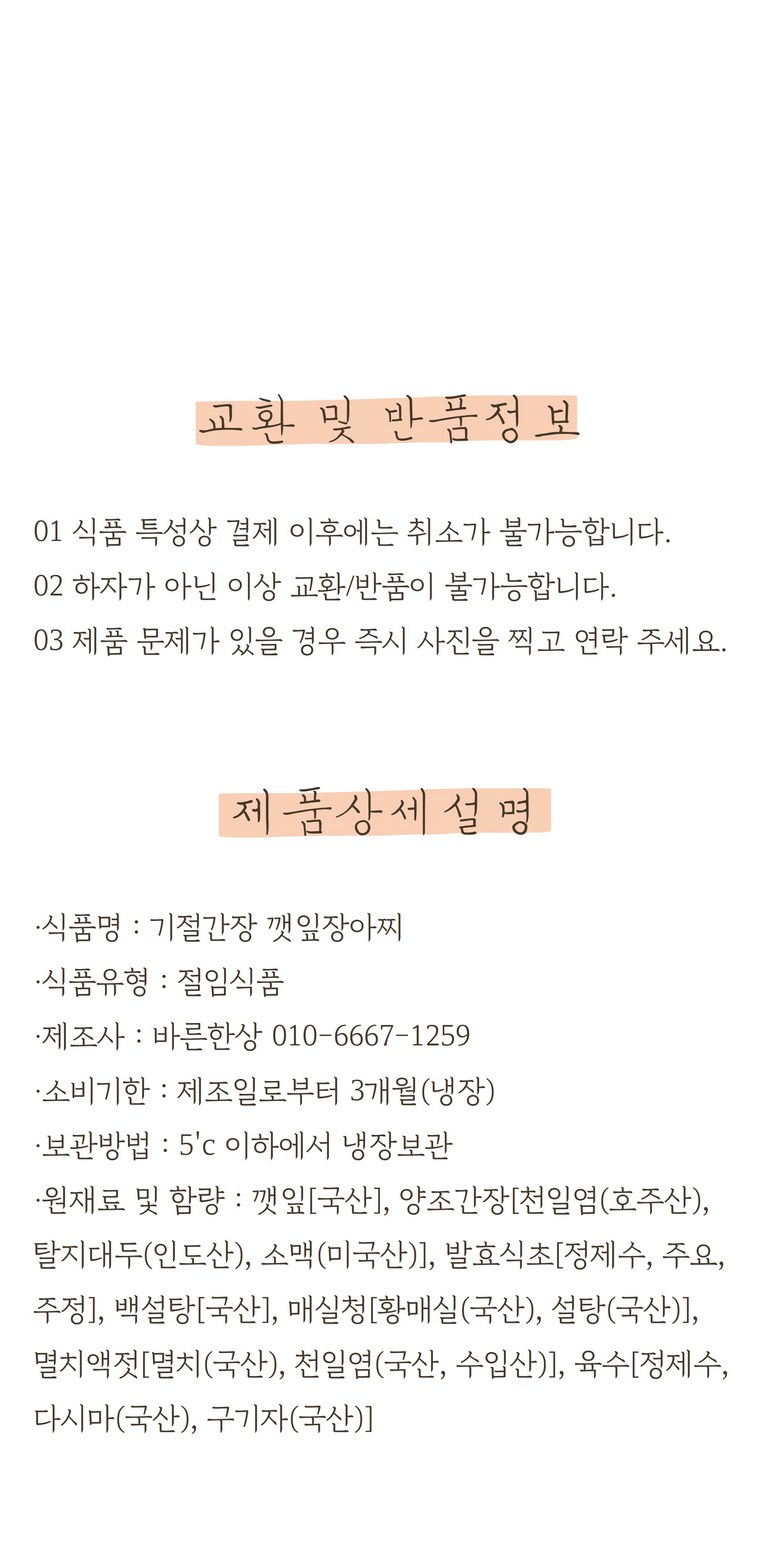 | 생산자 및 소재지 | 바른한상 (대구광역시 달서구 갈밭로82-8, 1층 바른한상) | 제조연월일, 소비기한 또는 품질유지기한 | 모든 제품은 1주일 이내 만든제품이고, 최근 제조한 제품을 보내드립니다.!유통기한은 냉장보관할 경우 3개월입니다. |
