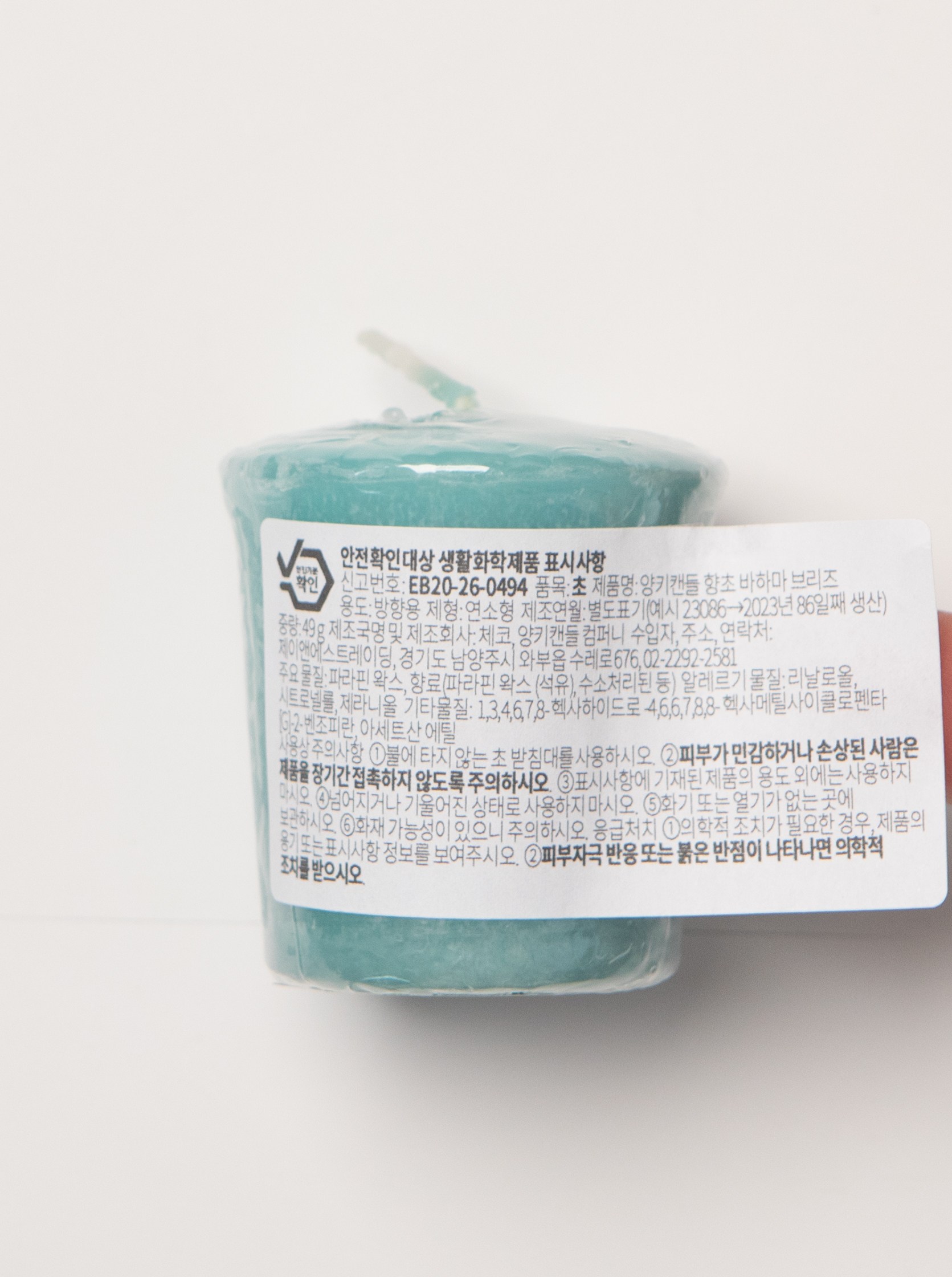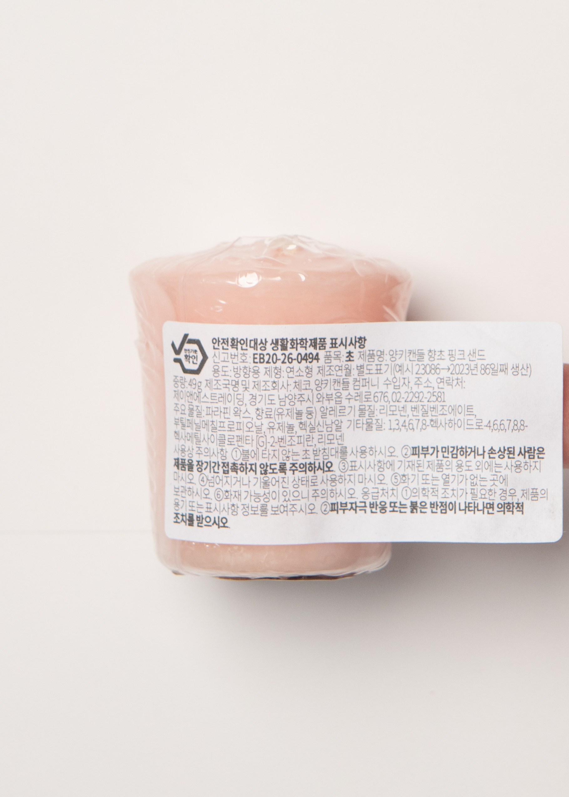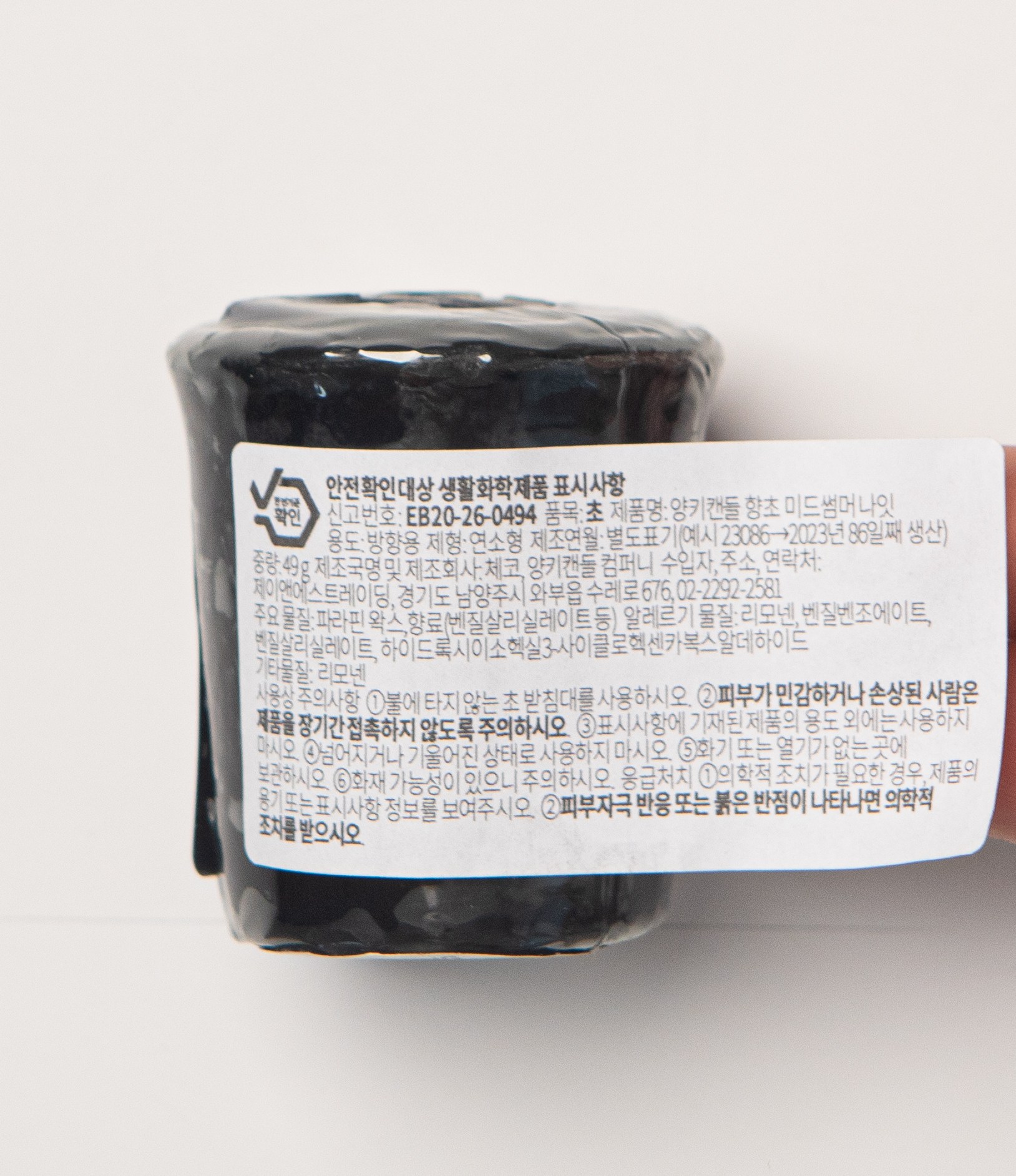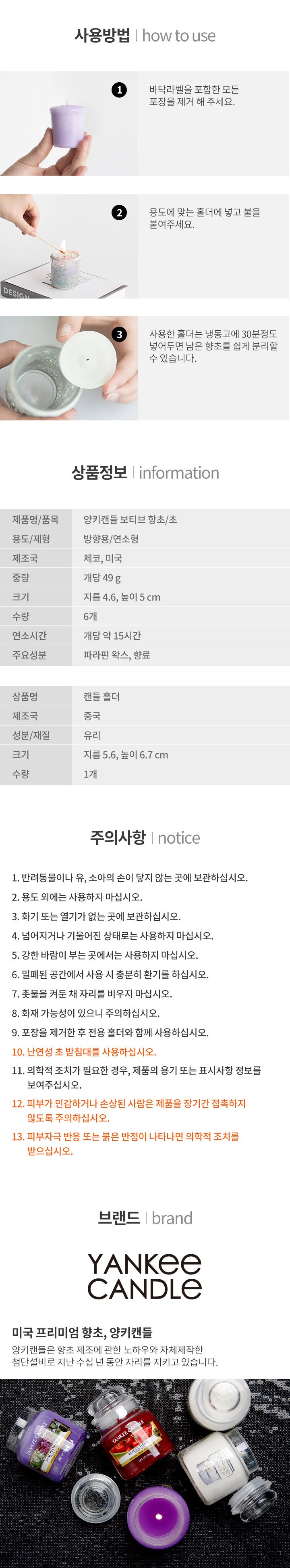 | 품목 및 제품명 | 초 / 양키캔들 향초, 양키캔들 향초 핑크 샌드, 양키캔들 향초 바하마 브리즈, 양키캔들 향초 블랙 체리, 양키캔들 향초 미드썸머나잇, 양키캔들 향초 레몬 라벤더 | 용도(표백제의 경우 계열을 함께표시) 및 제형 | 방향용 / 연소형 |