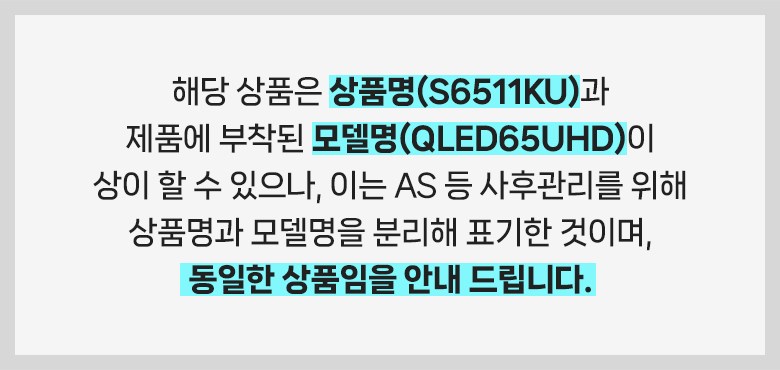 | 품명 및 모델명 | 텔레비전 수상기 스탠드형 방문설치 QLED65UHD 인증모델명: NEW S6511KU QLED | KC 인증정보 | 본품: XU090511-22009A,R-R-ah2-GTDSHUZGG65 / 특정소출력 무선기기: R-C-Gsd-WCT2GM2511 / 건전지: B053R224-7001 |