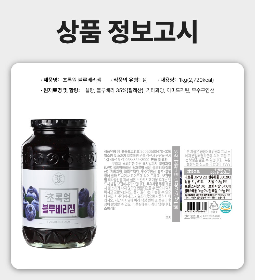 | 제품명 | 초록원 블루베리잼 | 식품의 유형 | 컨텐츠 참조 |