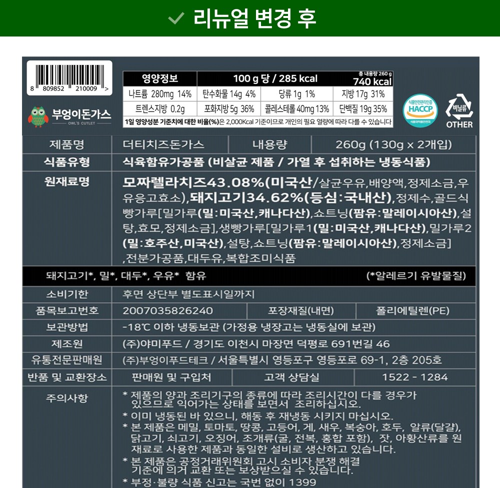 | 포장단위별 내용물의 용량(중량), 수량 | 260g x 2개 | 원재료명 및 함량 | 컨텐츠 참조 |