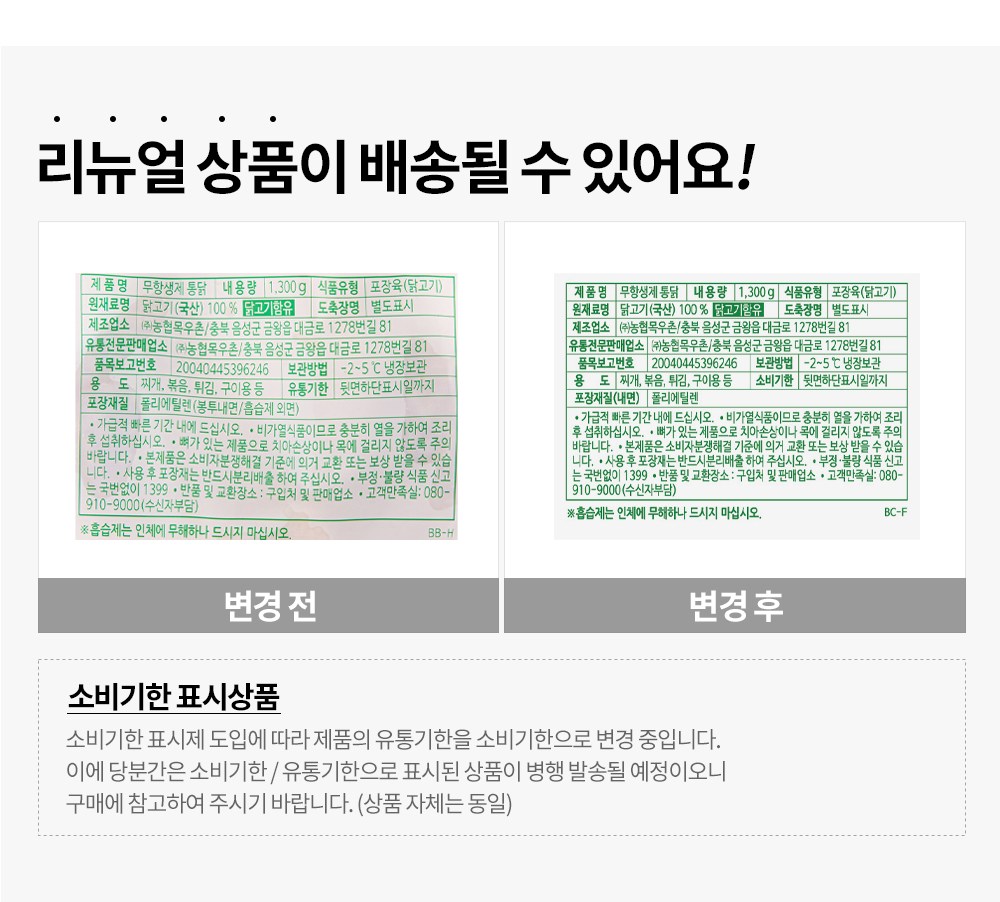 | 제조연월일, 소비기한 또는 품질유지기한 | 소비기한(또는 유통기한) : 2025년 12월 23일 이거나 그 이후인 상품<br />제조년월일 : 2025년 12월 15일 이후인 제조상품 | 세부 품목군별 표시사항 | 축산물 등급표시: 해당없음 / 이력번호 표시유무 - 이력번호 표시제품임 |