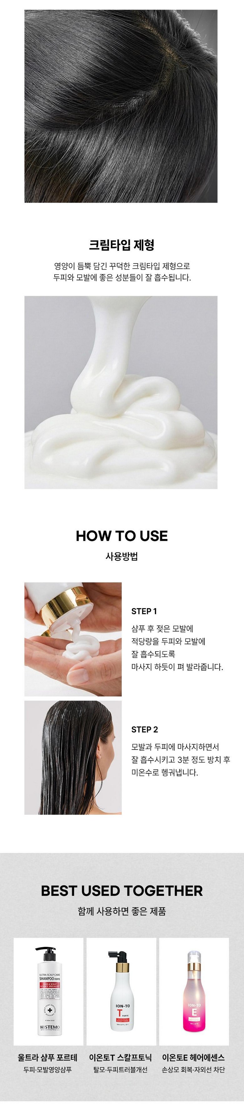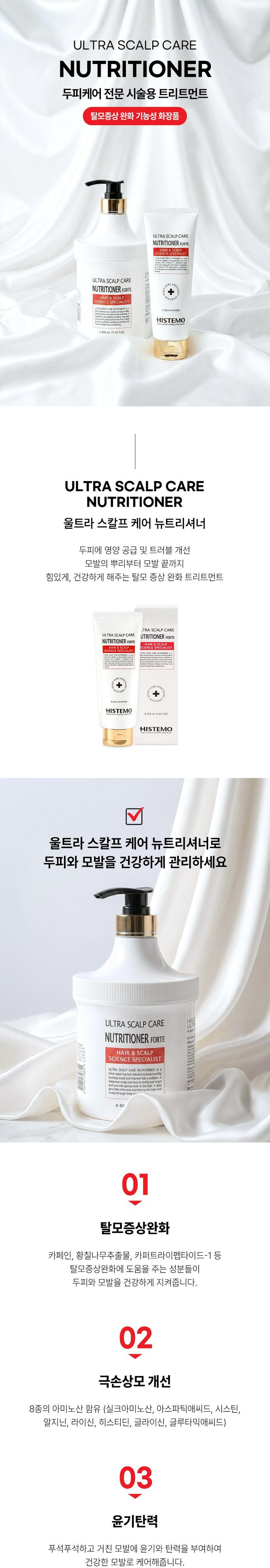 | 용량(중량) | 250ml | 제품 주요 사양 | 전국 1500여 미용실, 병원, 두피관리실에서 시술용으로 사용중인 전문가용 제품입니다. 모발에 영양과 보습,윤기를 공급하고 두피에 영양을 공급해주는 모발+두피 올인원 트리트먼트 입니다. 탈모증상완화 기능성 화장품으로 모발의 건강 뿐 아니라 탈모 증상에도 도움이 되는 제품입니다. 건조하고 트러블 있는 두피, 푸석푸석하고 손상된 모발에 영양을 부여해 줍니다. 실크아미노산 등 8가지 단백질 성분이 포함되어 손상된 모발의 회복에 도움을 주고 건강하게 해줍니다. |