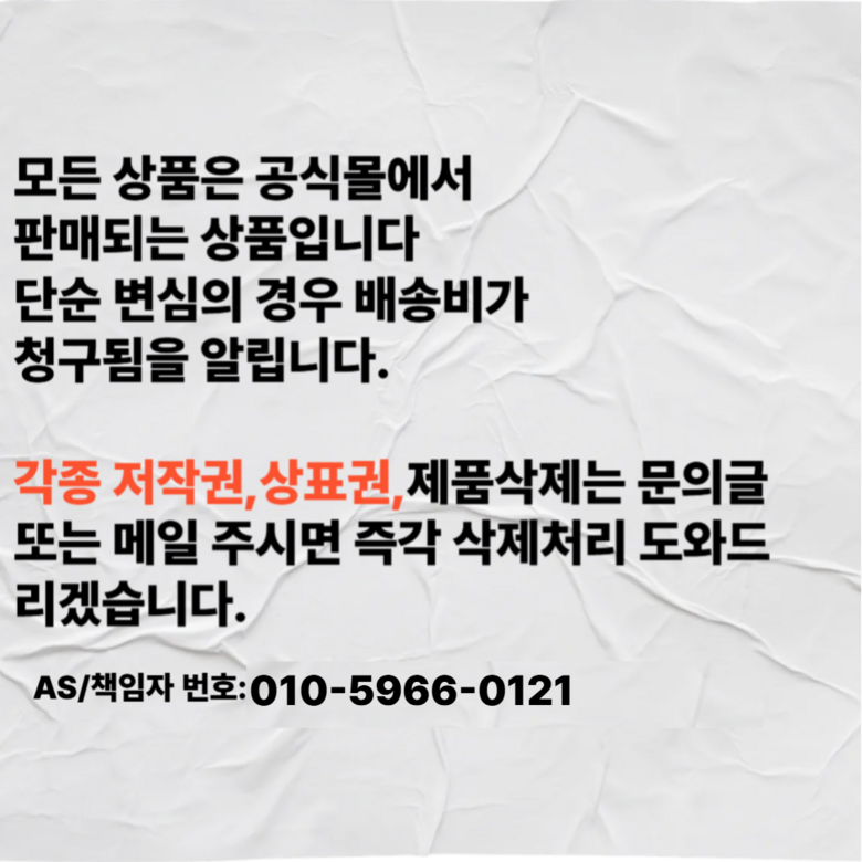 - ㆍ모니터 해상도의 차이로 인해 색상이나 이미지가 실제와 달라, 고객이 단순 변심으로 교환/반품을 무료로 요청하는 경우