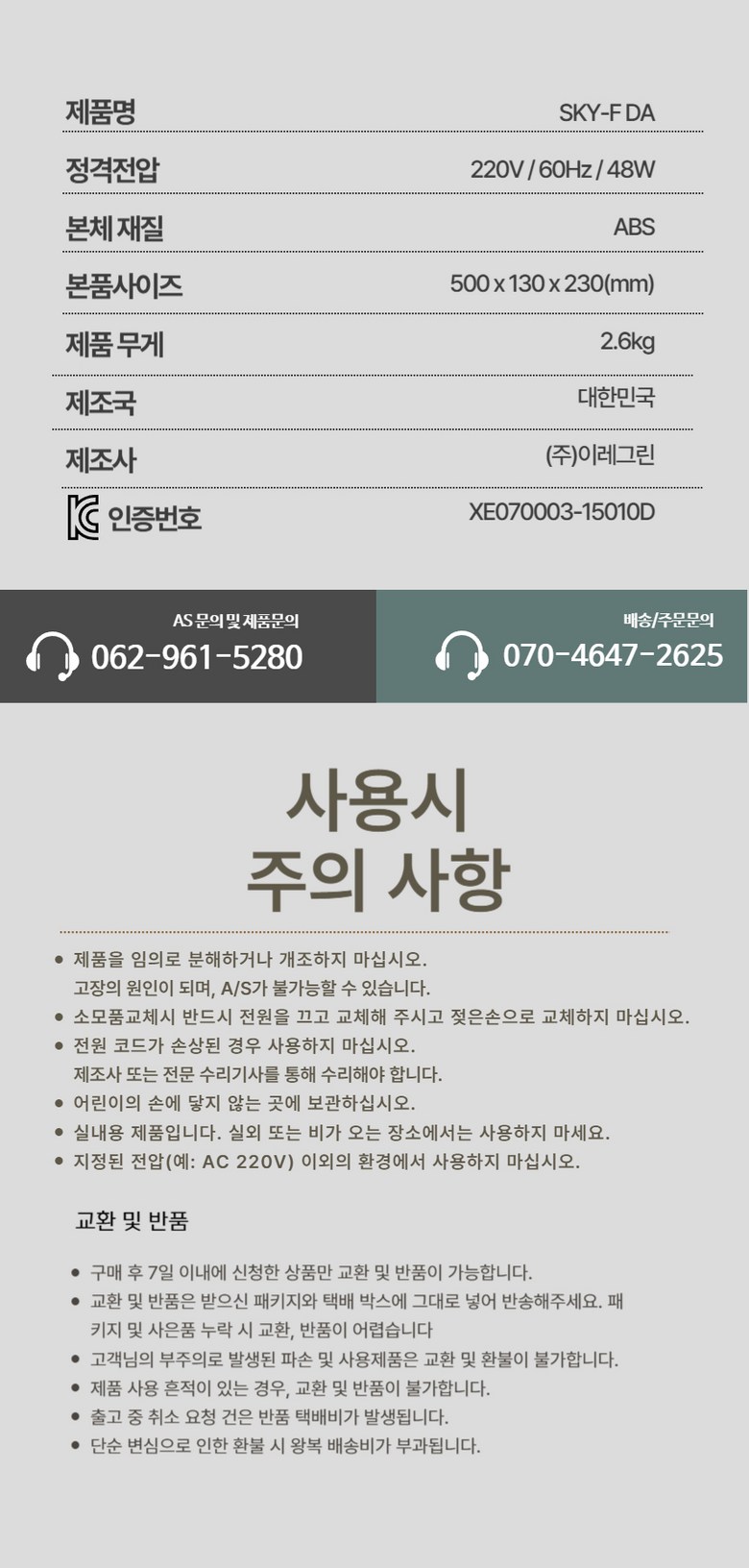 | 품명 및 모델명 | SKY-F DA | KC 인증정보 | XE070003-15010D |