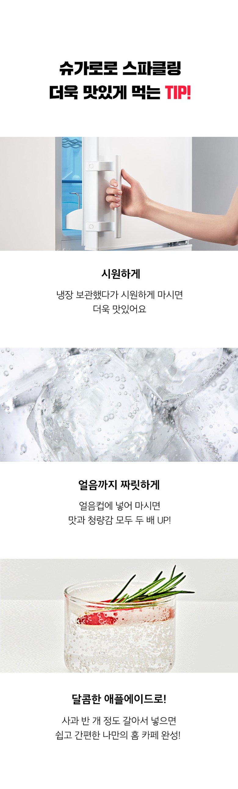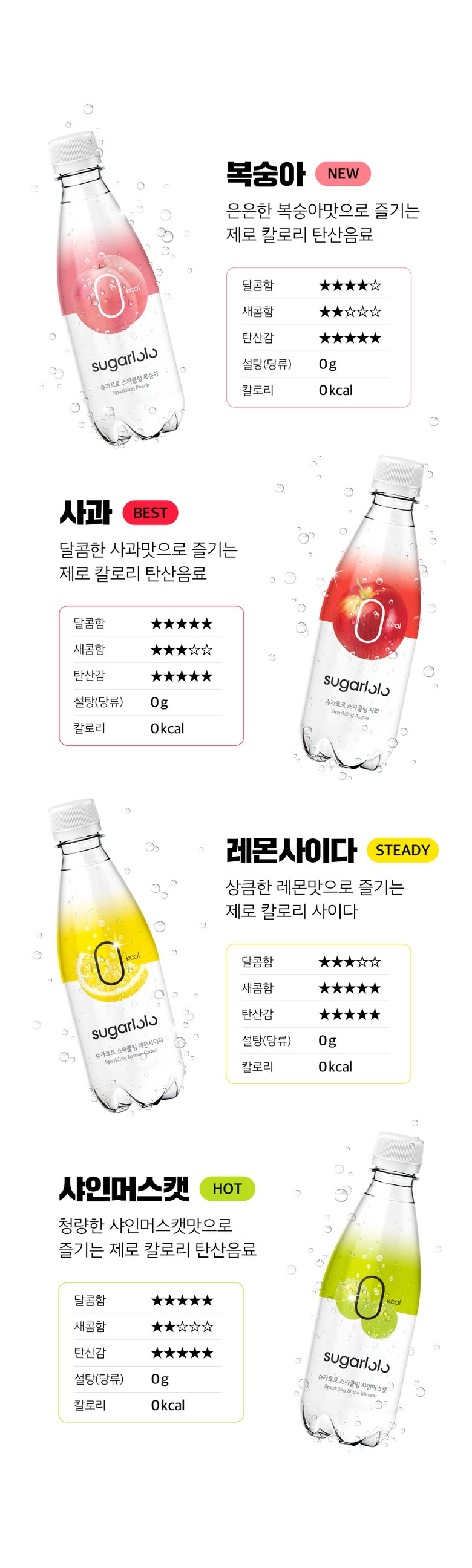 타사의 탄산음료가 다소 자극적이고 당도가 높게 느껴졌다면, 슈가로로는 그에 비해 훨씬 더 부드럽고 세련된 맛입니다. 개별 병 디자인도 깔끔해서 선물용으로도 손색이 없고요. 0칼로리가 맞을까싶을 탄산도 많고 맛도