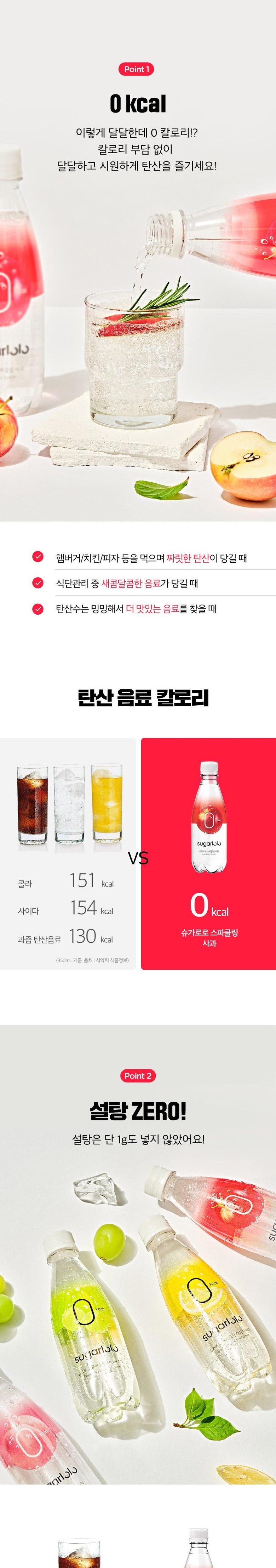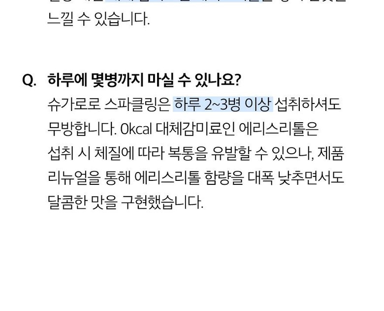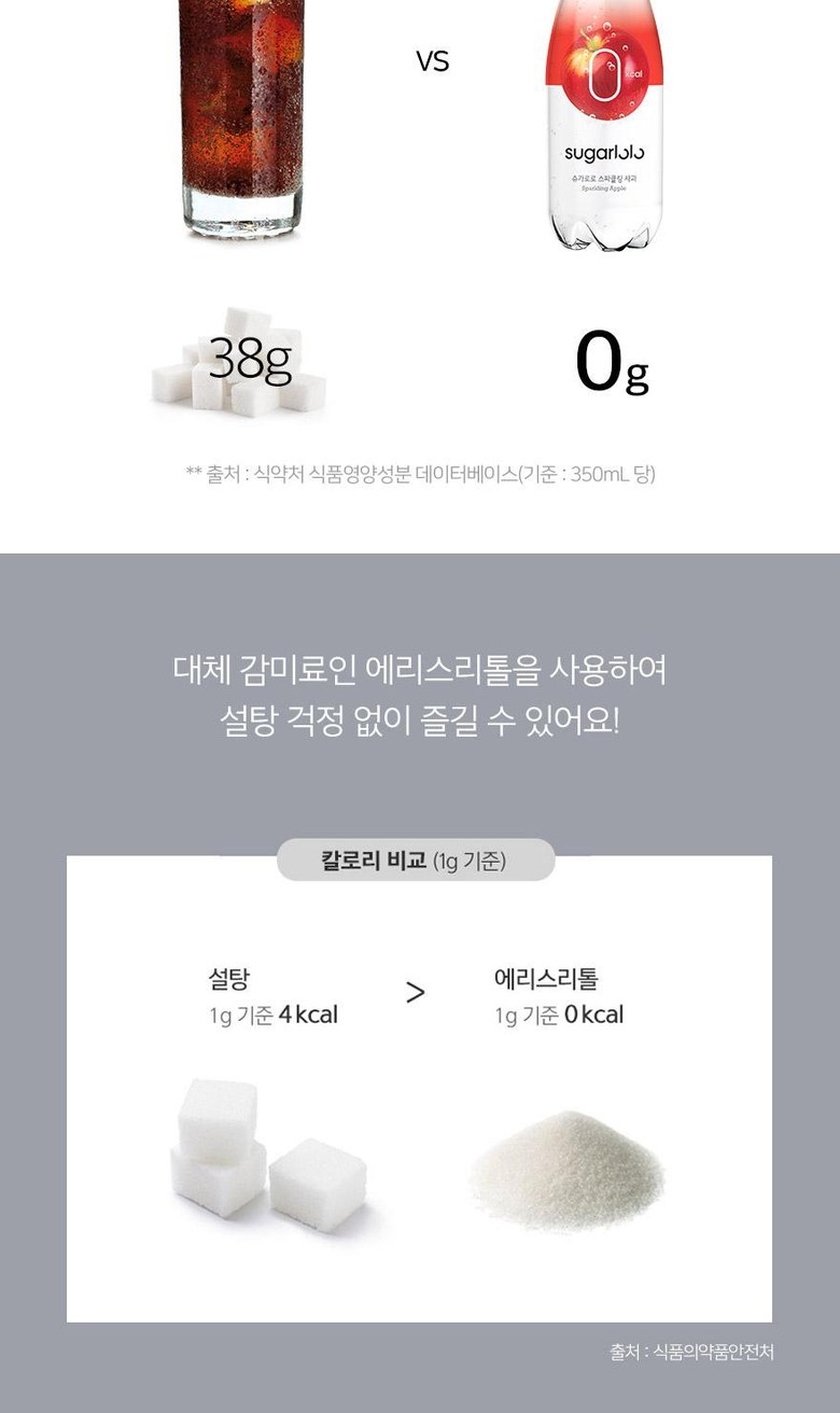 * 슈가로로 스파클링은 하루 2-3병 이상 섭취해도 무방하다고 합니다. 0kcal 대체 감미료인 에리스리톨은 섭취 시 체질에 따라 복통을 유발할 수 있으나, 제품 리뉴얼을 통해 에리스리톨 함량을 대폭 낮추면서도 달콤한 맛을 구현해냈기 때문에 크게 걱정하지 않으셔도 될 것 같습니다.