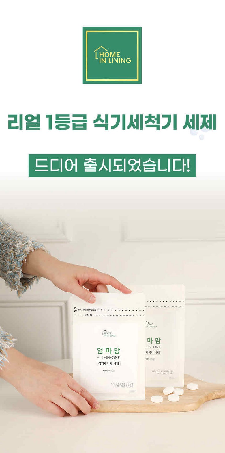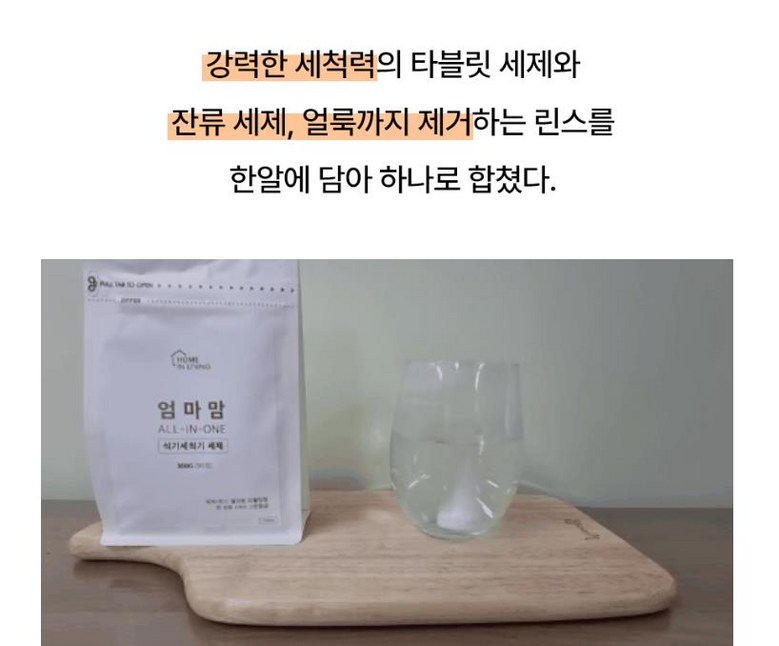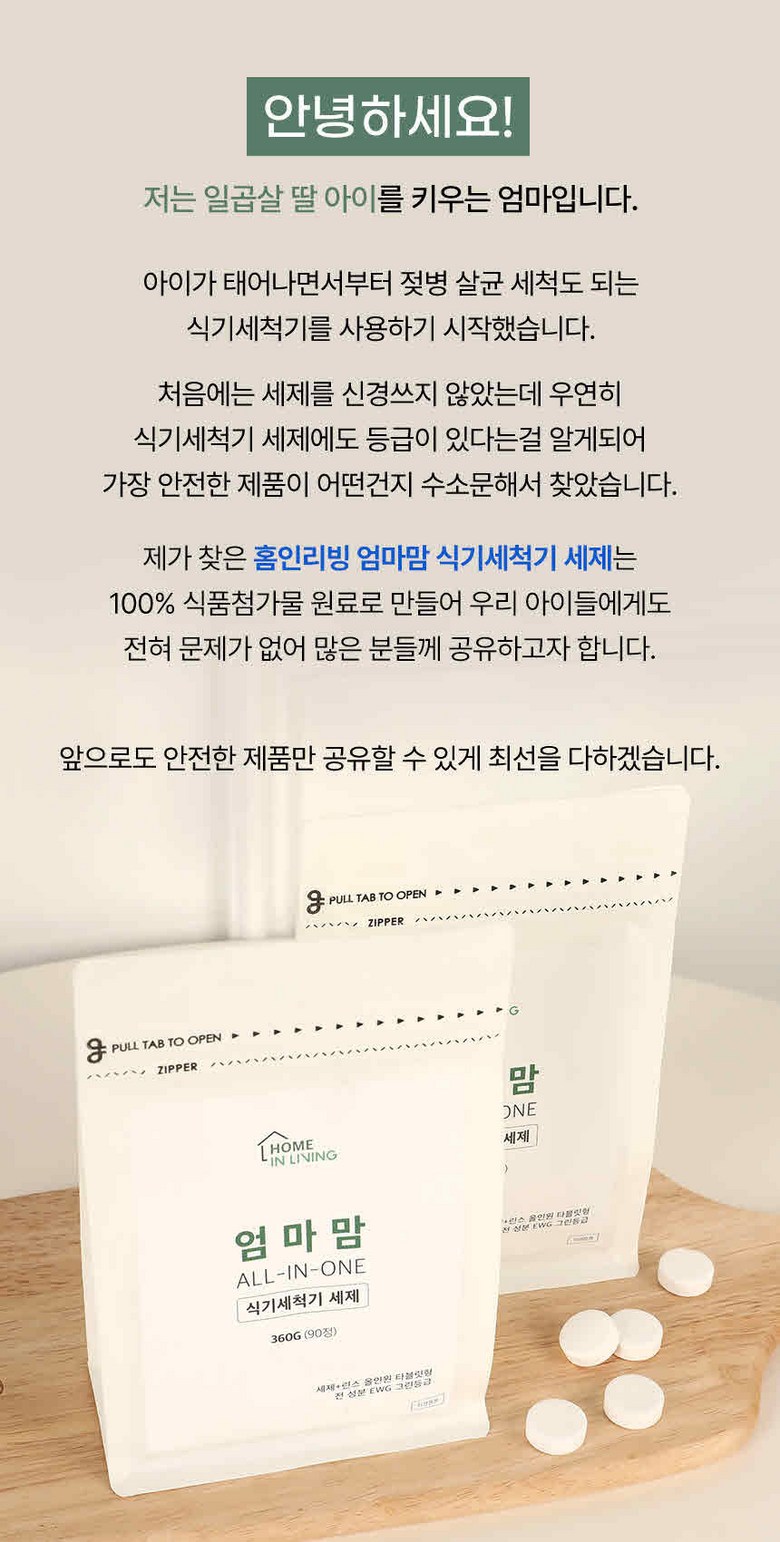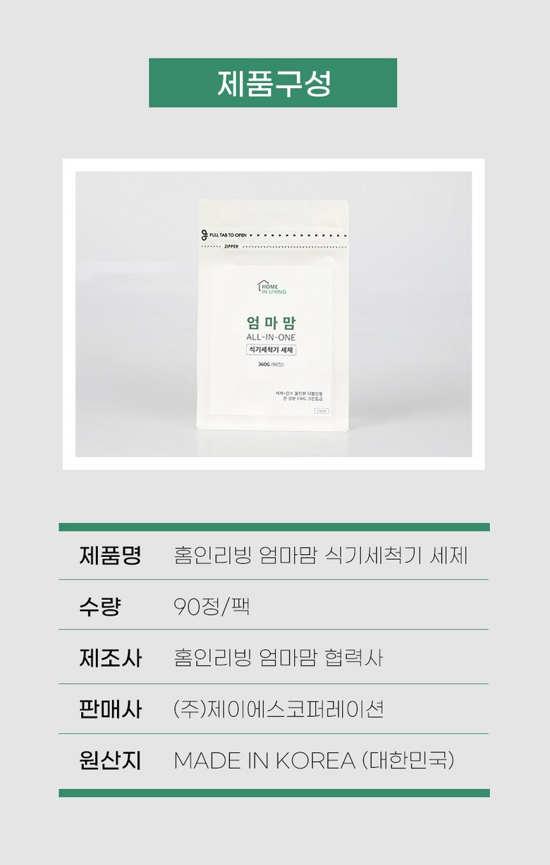 | 품목 및 제품명 | 엄마맘 식기세척기 세제 | 용도(표백제의 경우 계열을 함께표시) 및 제형 | 식기세척기&젖병세척기 전용 |