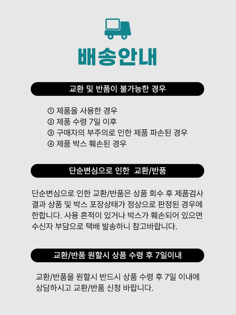 - ㆍ교환/반품에 관한 일반적인 사항은 판매자가 제시사항보다 관계법령이 우선합니다.