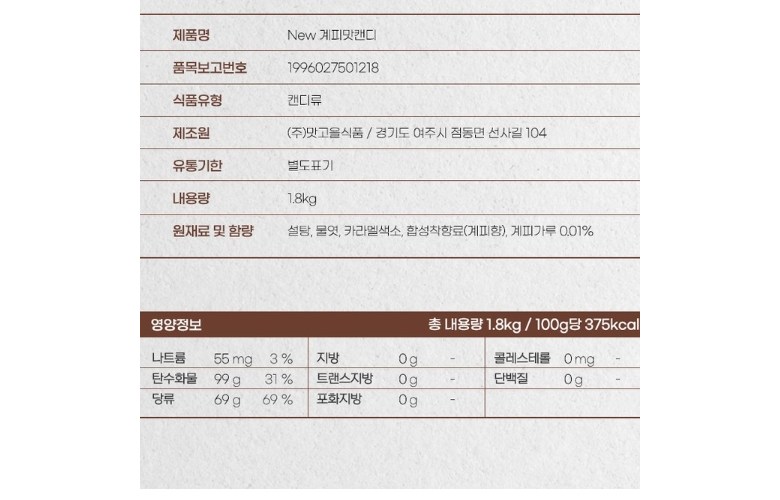 | 제조연월일, 소비기한 또는 품질유지기한 | 상품 상세페이지 참조 | 세부 품목군별 표시사항 | 상품 상세페이지 참조 |