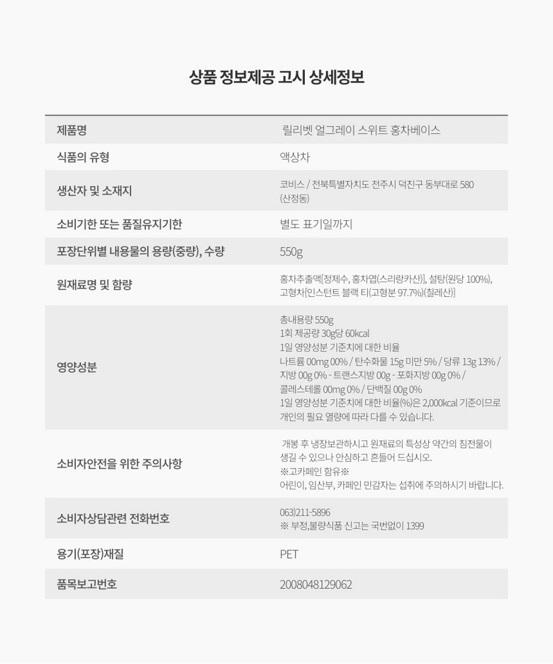 | 포장단위별 내용물의 용량(중량), 수량 | 1병 550g | 원재료명 및 함량 | 홍차추출액 60% (홍차엽 100% 스리링카산), 자일로스설탕 38%, 홍차추출분말 2% |