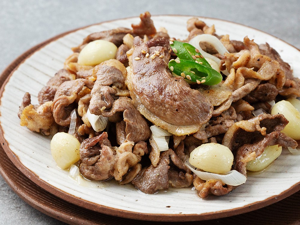 2. 오리고기와 마늘을 넓게 펼쳐 올려주세요.