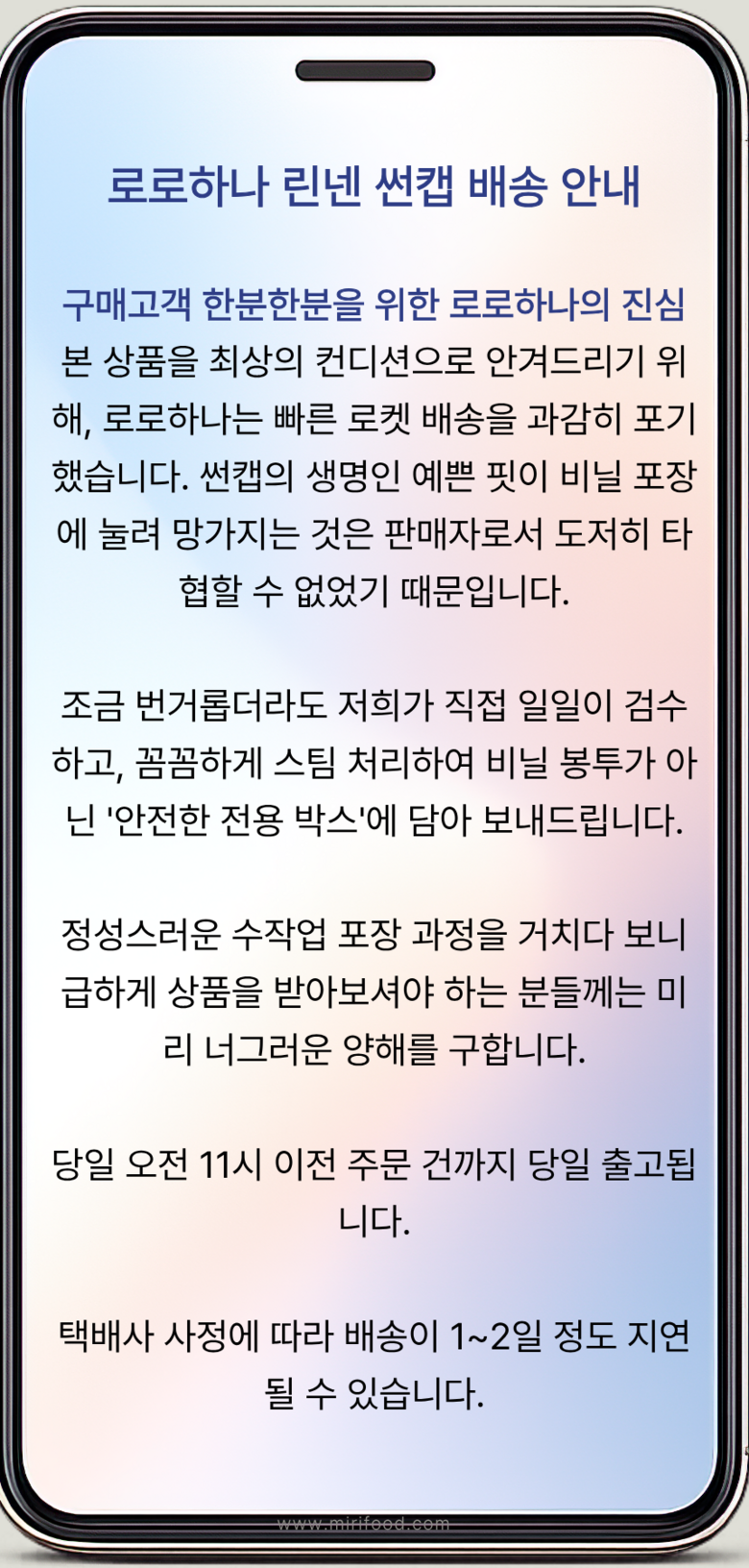 | 배송기간 | ㆍ도서산간 지역 등은 배송에 3-5일이 더 소요될 수 있습니다. - 천재지변, 물량 수급 변동 등 예외적인 사유 발생 시, 다소 지연될 수 있는 점 양해 부탁드립니다. | ||