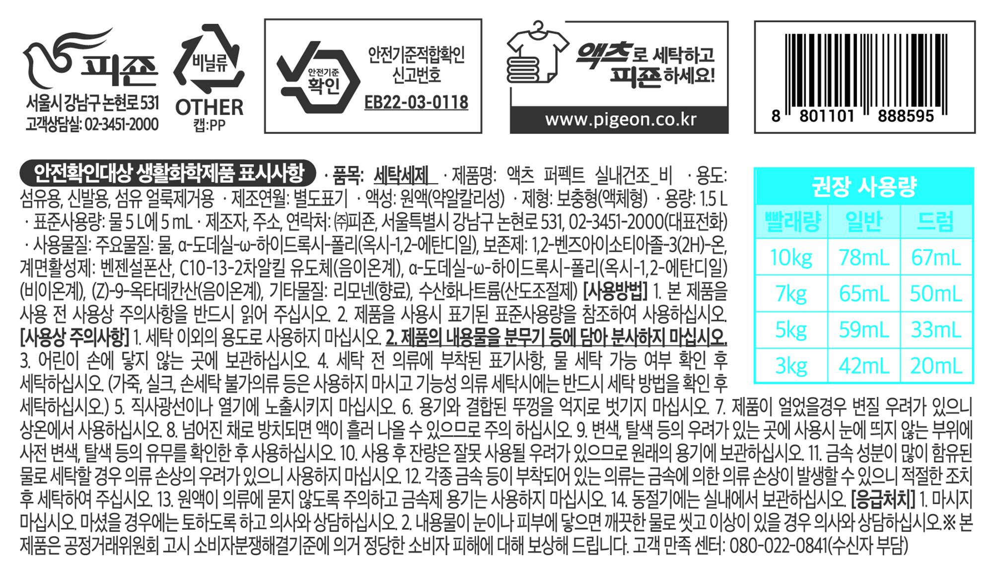 | 품목 및 제품명 | 세탁세제 / 액츠 퍼펙트 실내건조_비 | 용도(표백제의 경우 계열을 함께표시) 및 제형 | 신발용,섬유용,섬유 얼룩제거용 / 비분사형-액체형 |