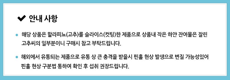 | 제품명 | 할라페뇨 슬라이스 | 식품의 유형 | 컨텐츠참조 |