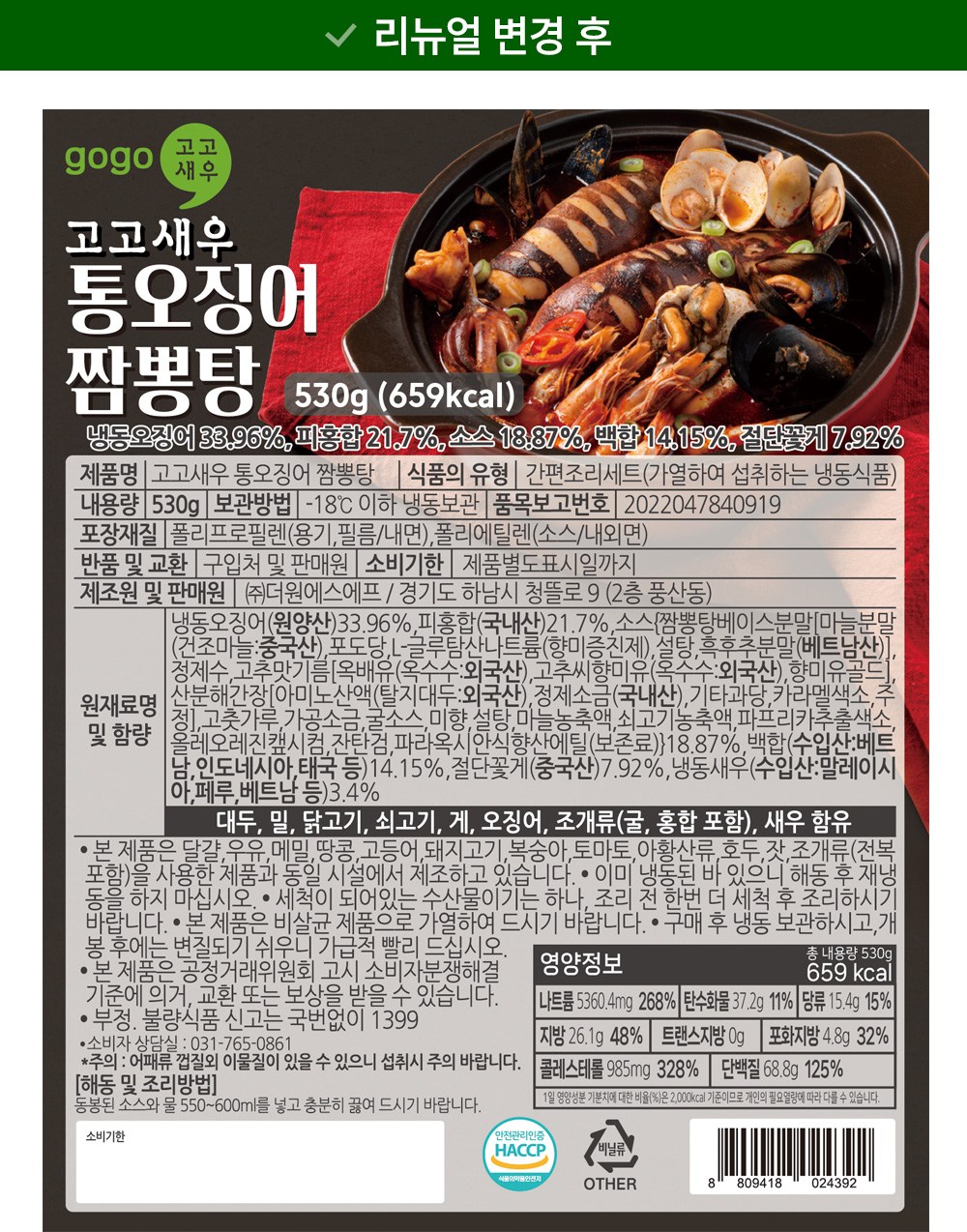 | 포장단위별 내용물의 용량(중량), 수량 | 530g x 4개 | 원재료명 및 함량 | 컨텐츠 참조 |