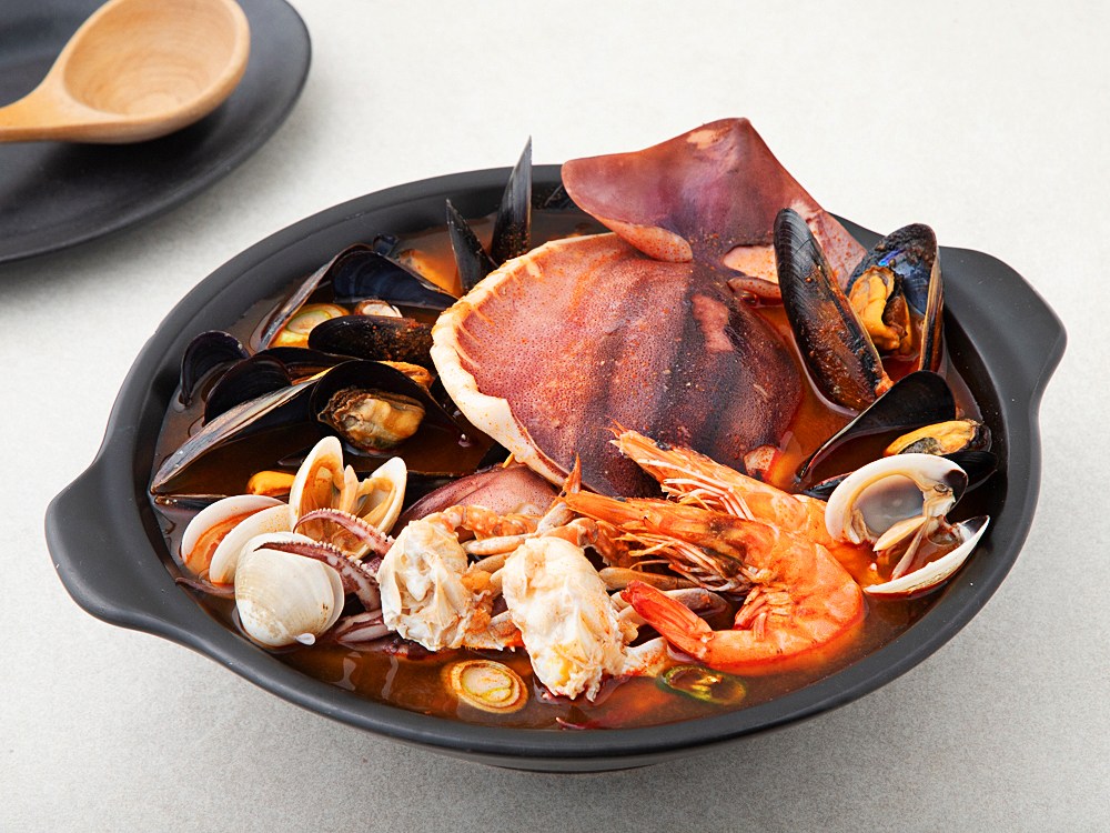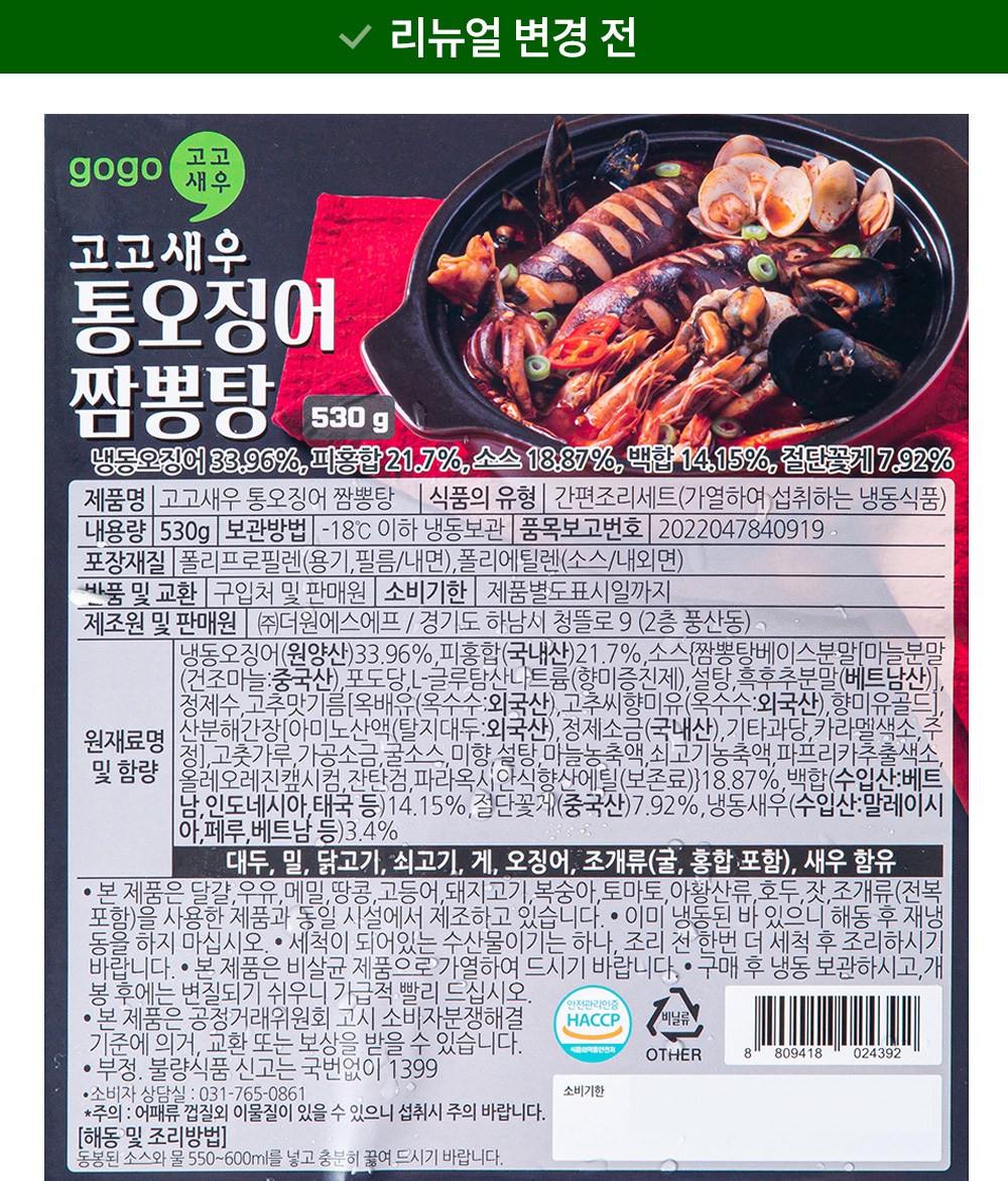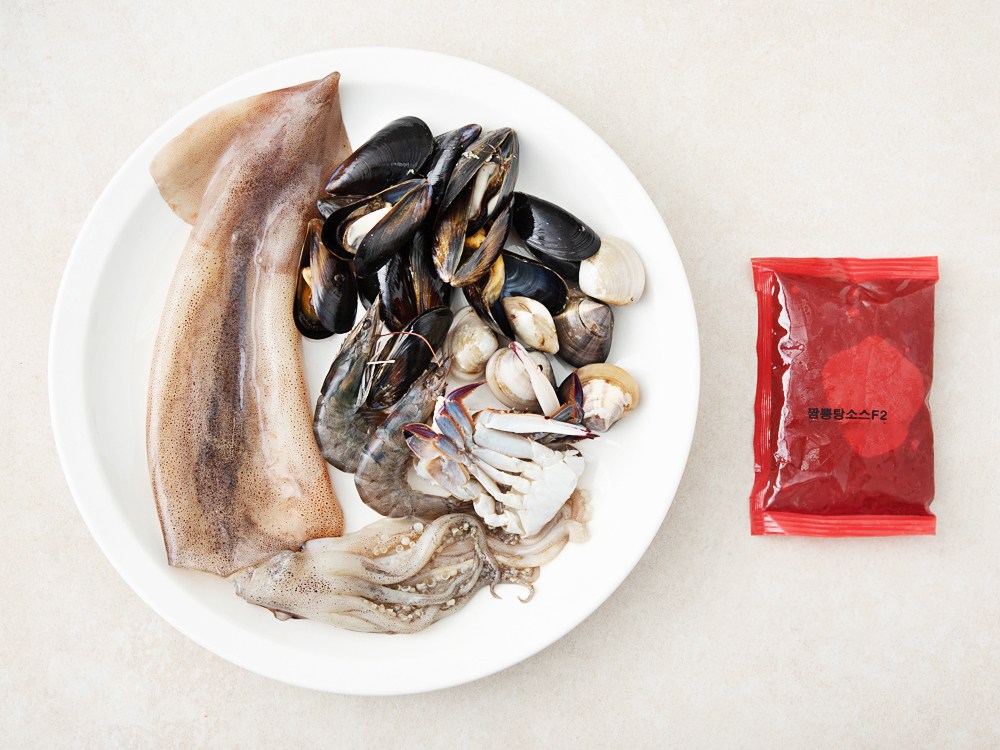 냉동오징어, 피홍합, 백합, 절단 꽃게, 냉동 새우, 소스로 구성되어 있습니다.