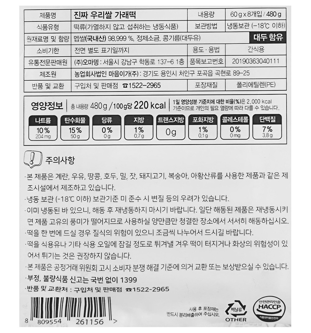 | 포장단위별 내용물의 용량(중량), 수량 | 480g x 4개,1개 | 원재료명 및 함량 | 컨텐츠 참조 |