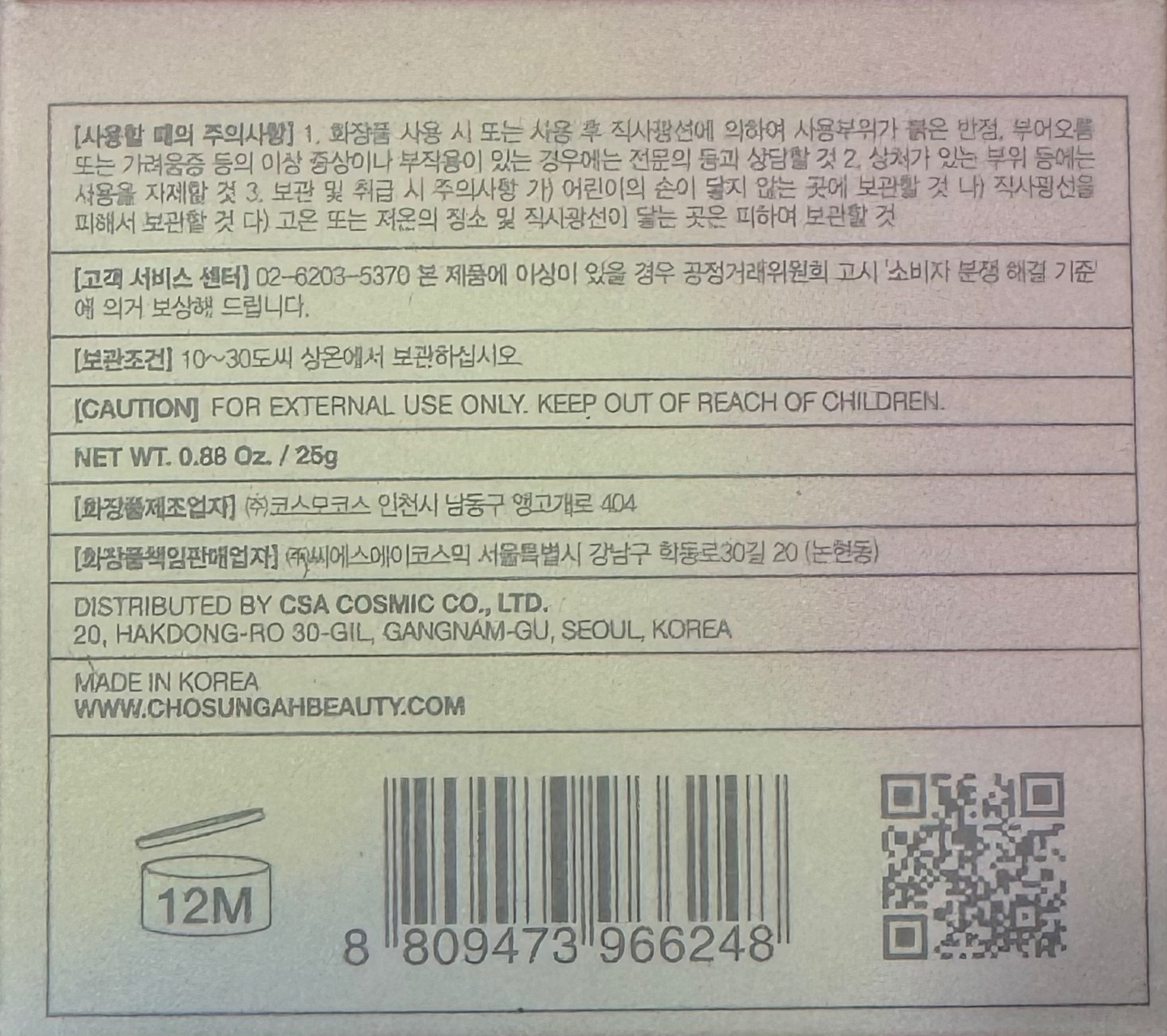| 화장품제조업자, 화장품책임판매업자 및 맞춤형화장품판매업자 | 컨텐츠 참조 | 제조국 | 대한민국 |