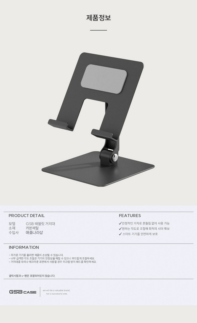 | 품명 및 모델명 | GSB 갤럭시탭 아이패드 태블릿 스탠드 거치대 휴대용, 스페이스그레이 | 인증/허가 사항 | 해당없음 |