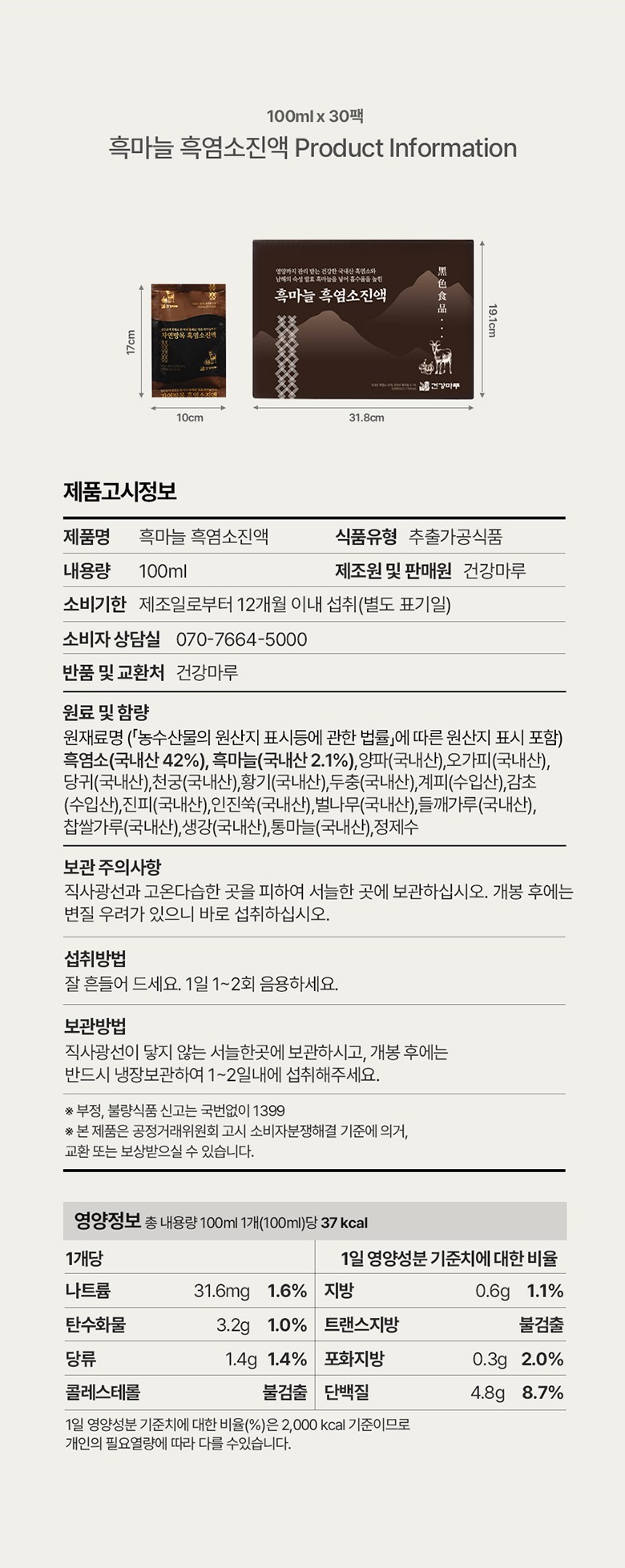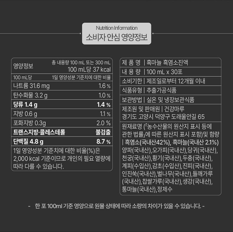 | 제품명 | 건강마루 흑염소진액 | 식품의 유형 | 추출가공식품 |
