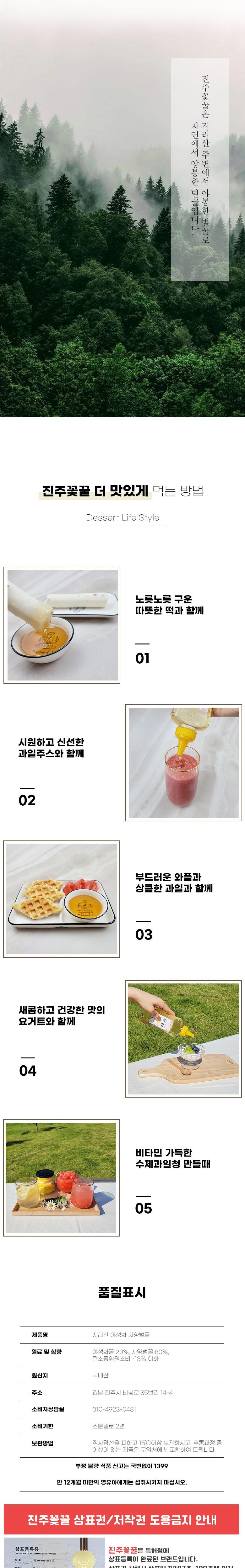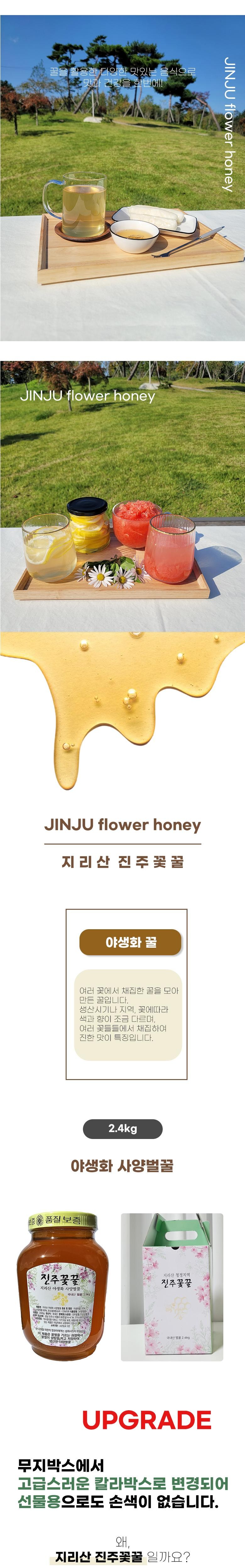 | 품목 또는 명칭 | 지리산 청정지역 진주꽃꿀 야생화 사양벌꿀 | 포장단위별 내용물의 용량(중량),수량,크기 | 2.4kg |