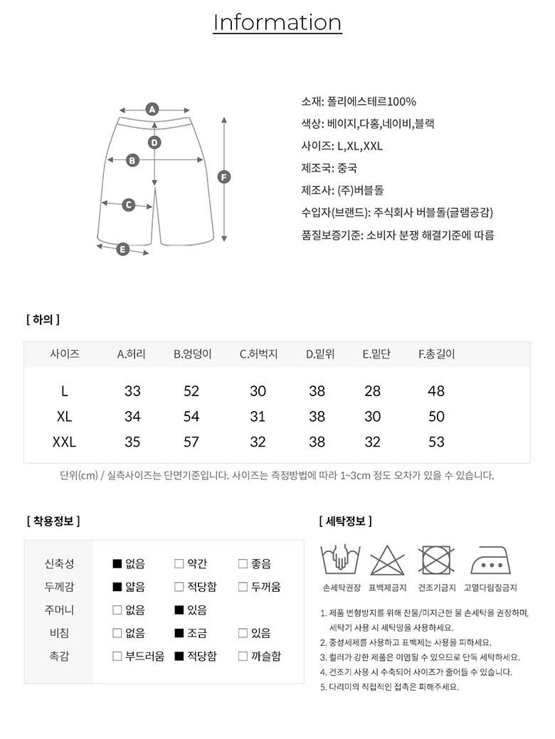 | 제조국 | 중국 | 세탁방법 및 취급시 주의사항 | 컨텐츠 참조 |