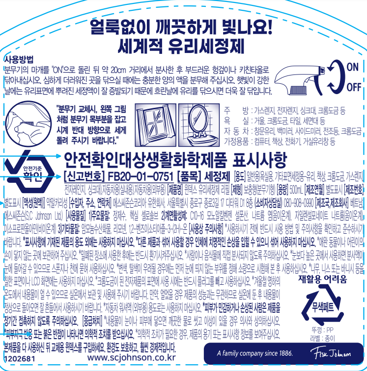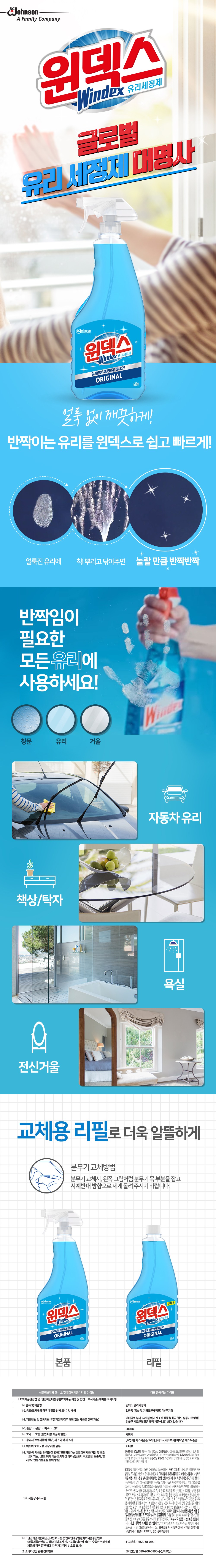 | 품목 및 제품명 | 세정제 / 윈덱스 유리세정제 리필 | 용도(표백제의 경우 계열을 함께표시) 및 제형 | 자동차용-외부용,일반용-기타표면세정용-유리, 책상, 크롬도금, 가스렌지, 전자레인지, 싱크대),일반용-욕실용,자동차용-실내용 / 분무기형 |