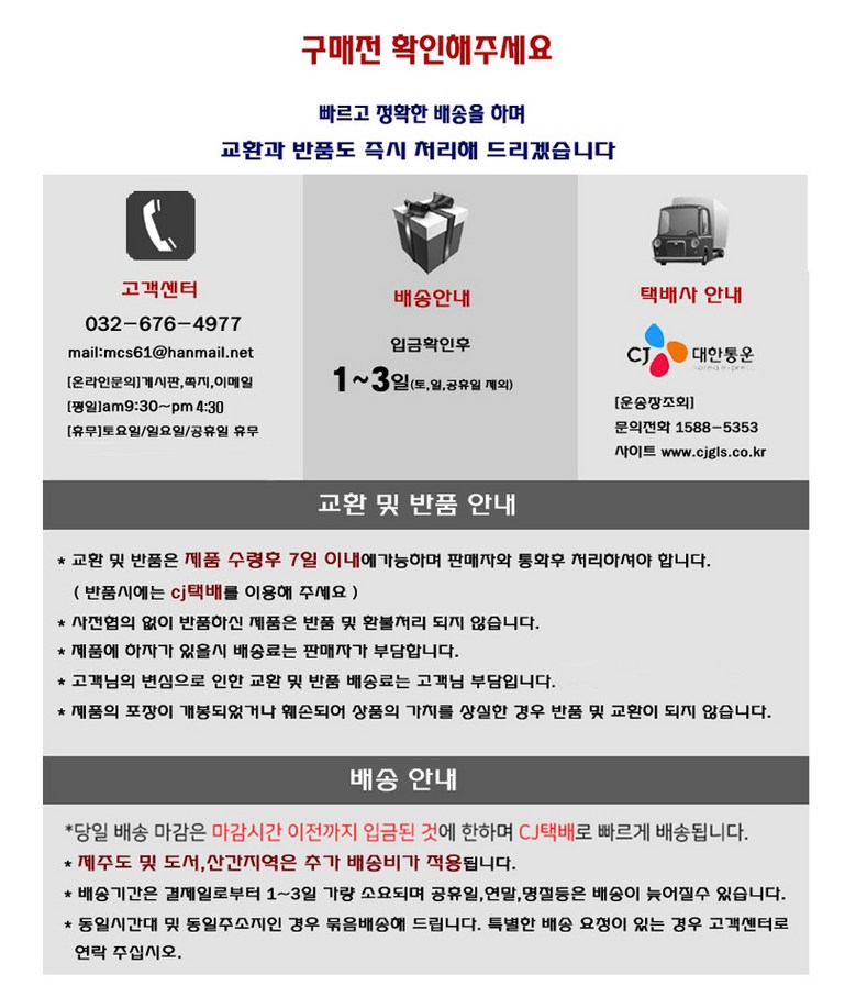 - ㆍ교환/반품에 관한 일반적인 사항은 판매자가 제시사항보다 관계법령이 우선합니다.