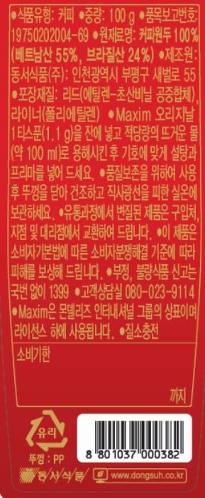 | 제품명 | 맥심 오리지날 100g | 식품의 유형 | 컨텐츠 참조 |