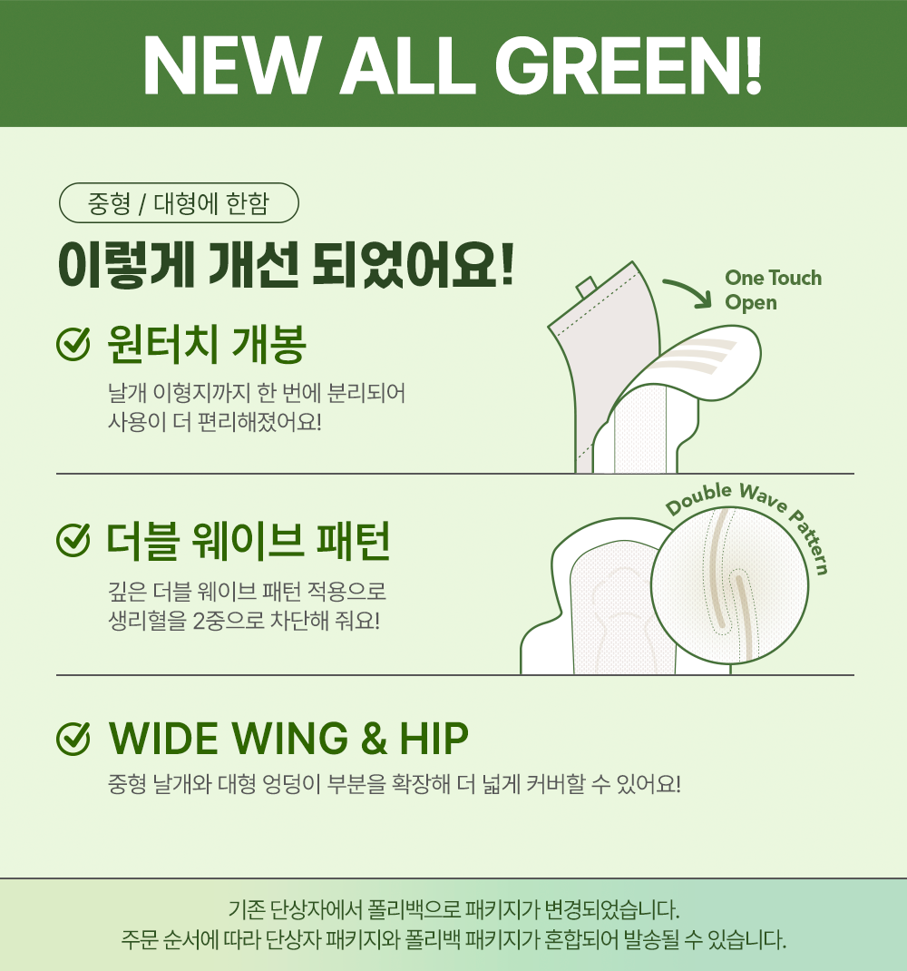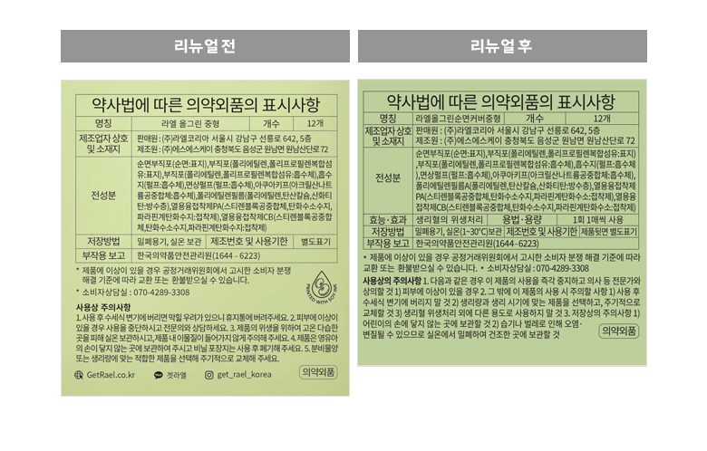 | 품명 및 모델명 | 리뉴얼 전 : 라엘올그린중형 / 리뉴얼 후 : 라엘올그린순면커버중형 | 인증/허가 사항 | 의약외품 |