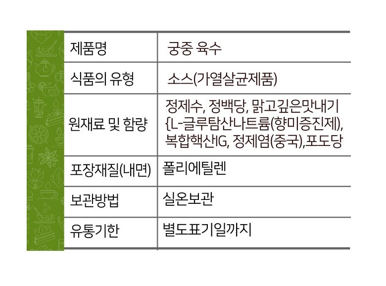 | 제품명 | 궁중 육수 | 식품의 유형 | 소스(가열살균제품) |