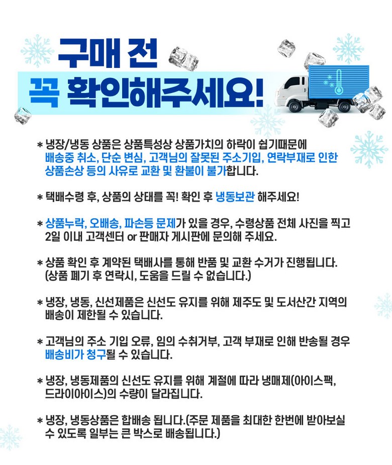 | 배송방법 | 신선/냉장/냉동 | 배송비 | 무료배송 - 도서산간 지역 배송불가 |