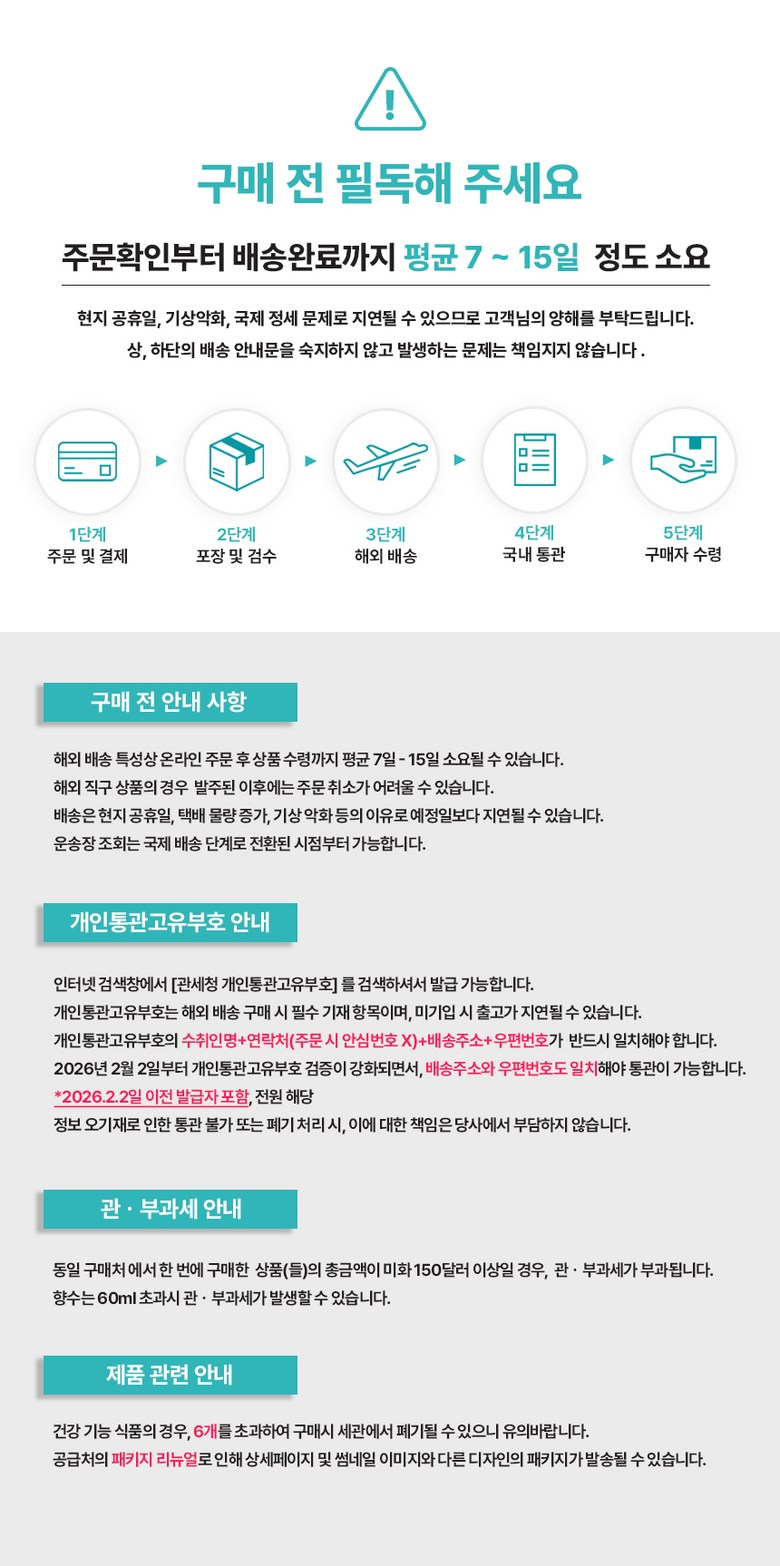 - 법규 개정에 따라 개인통관고유부호 검증 절차가 강화되었습니다. 결제 단계에서 받는 사람의 정보가 관세청 등록 정보 (성명, 휴대폰, 개인통관고유부호, 주소) 와 일치하는지 확인해주세요.