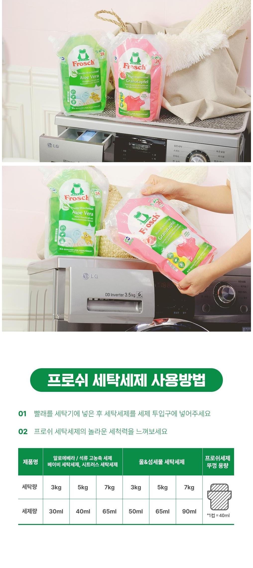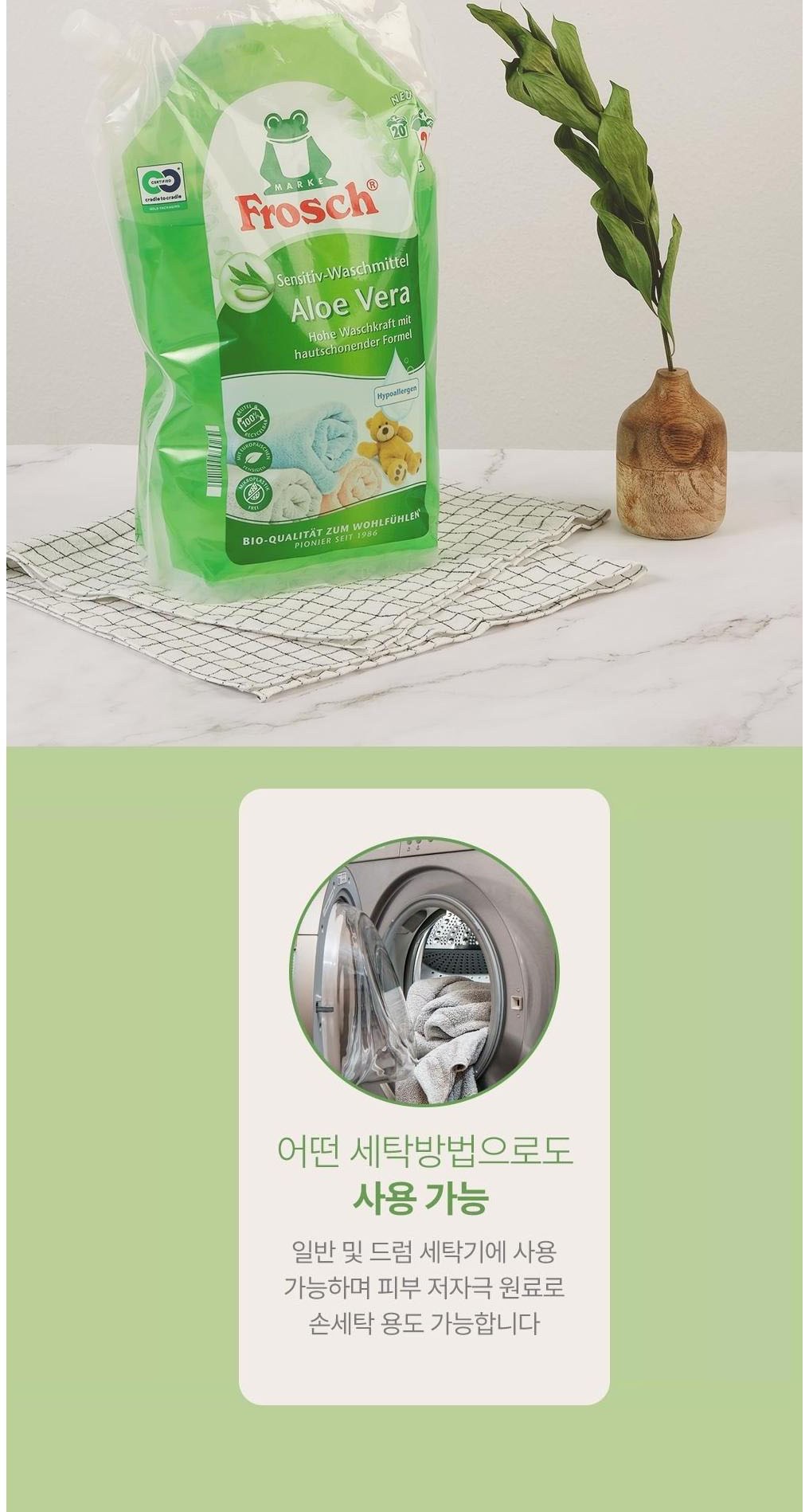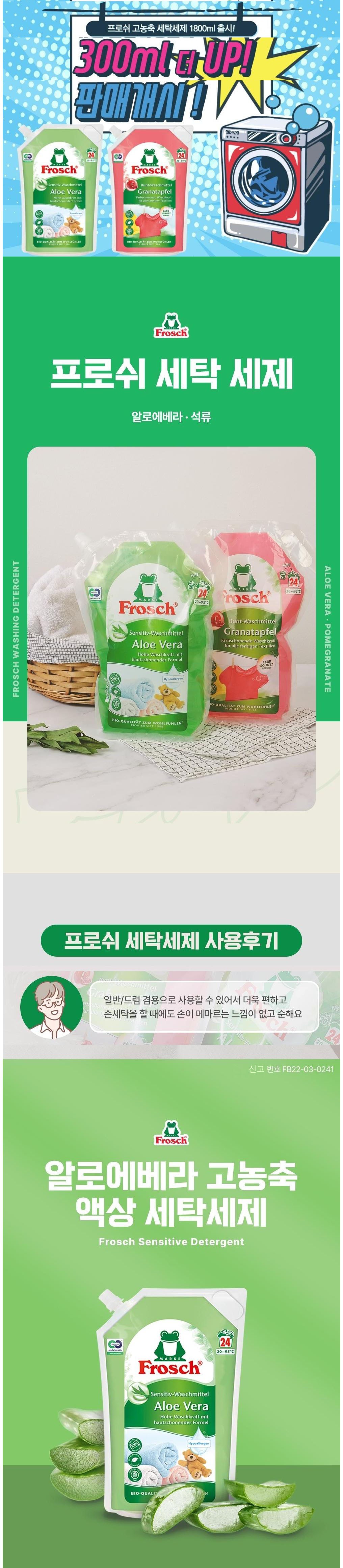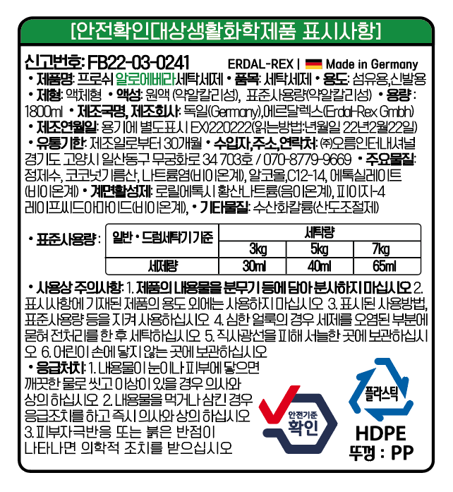 | 품목 및 제품명 | 세탁세제/프로쉬 세탁세제 알로에 Frosch waschmittel aloe vera | 용도(표백제의 경우 계열을 함께표시) 및 제형 | 섬유용/액체형 |