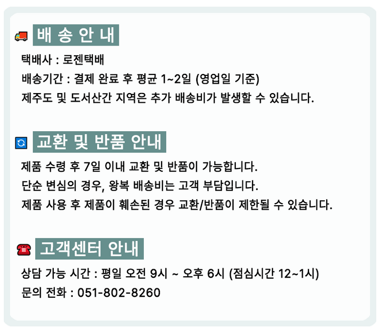 - ㆍ모니터 해상도의 차이로 인해 색상이나 이미지가 실제와 달라, 고객이 단순 변심으로 교환/반품을 무료로 요청하는 경우