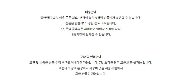 | 교환/반품 비용 (왕복비용) | 5,000원 - 단, 고객 변심의 경우에만 발생 - 도서산간 지역 배송불가 |