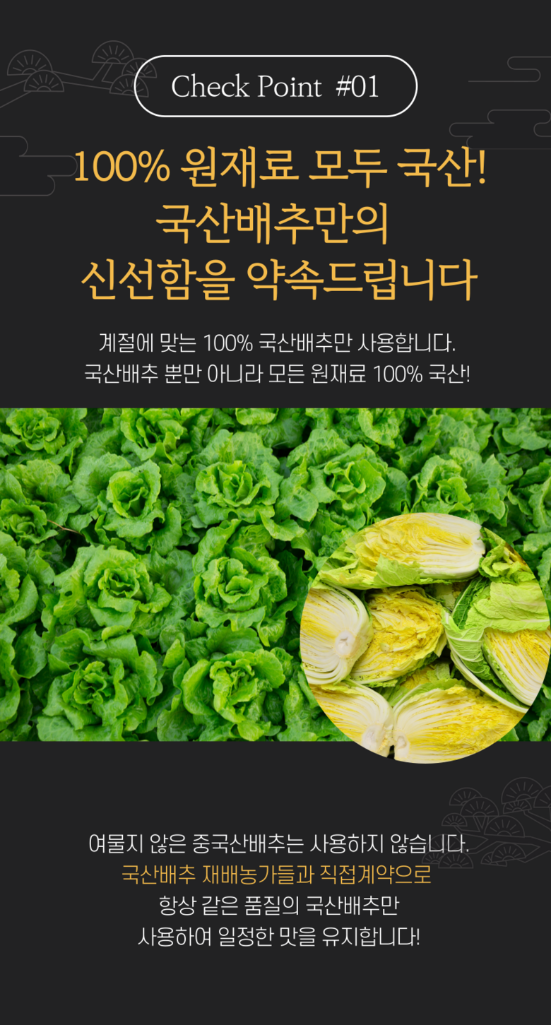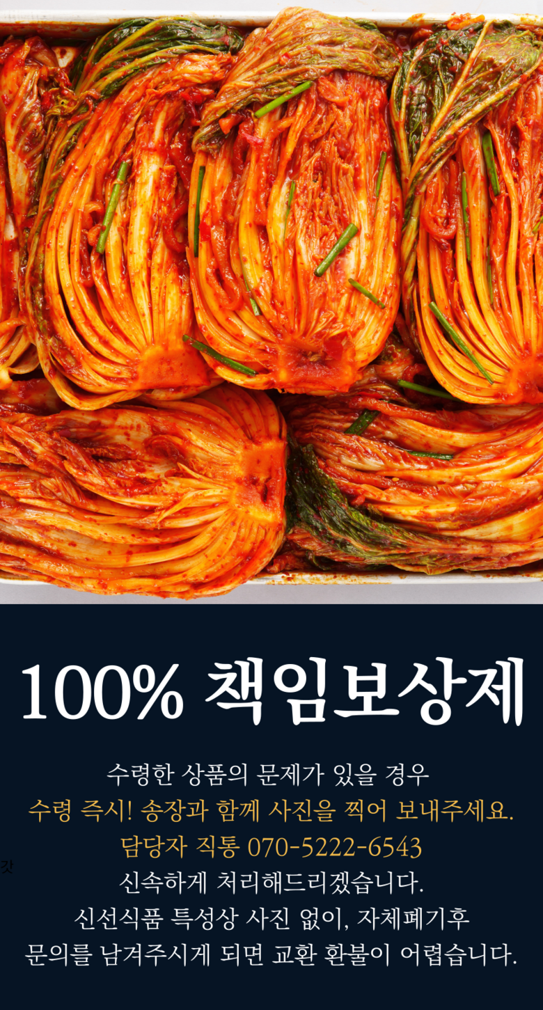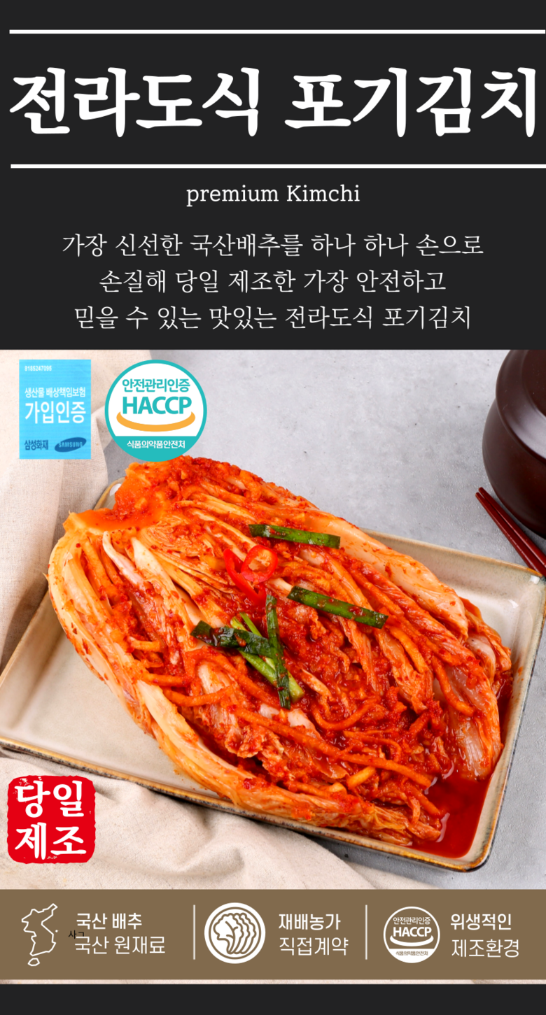 | 제품명 | 100% 국산 배추/양념 사용 전라도식 포기김치 배추김치 | 식품의 유형 | 포기김치,배추김치 |