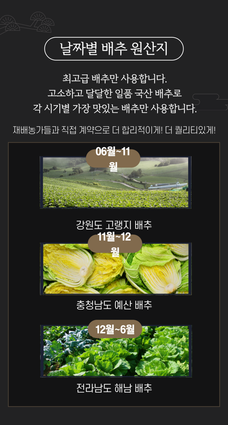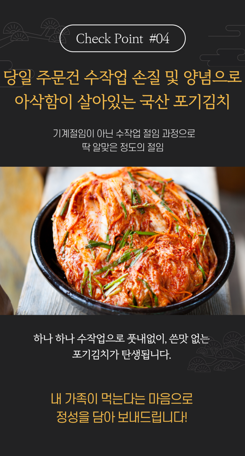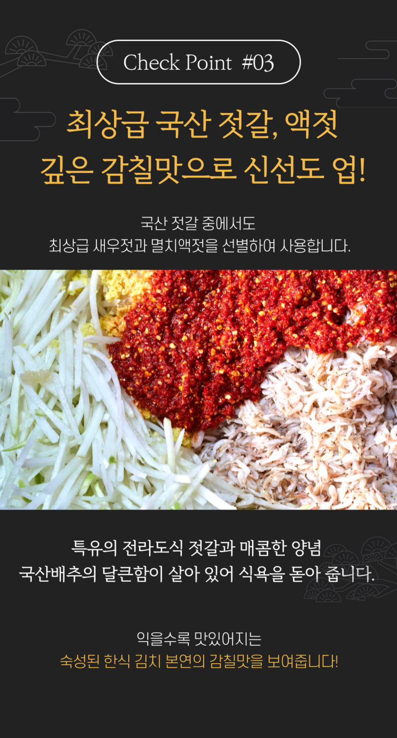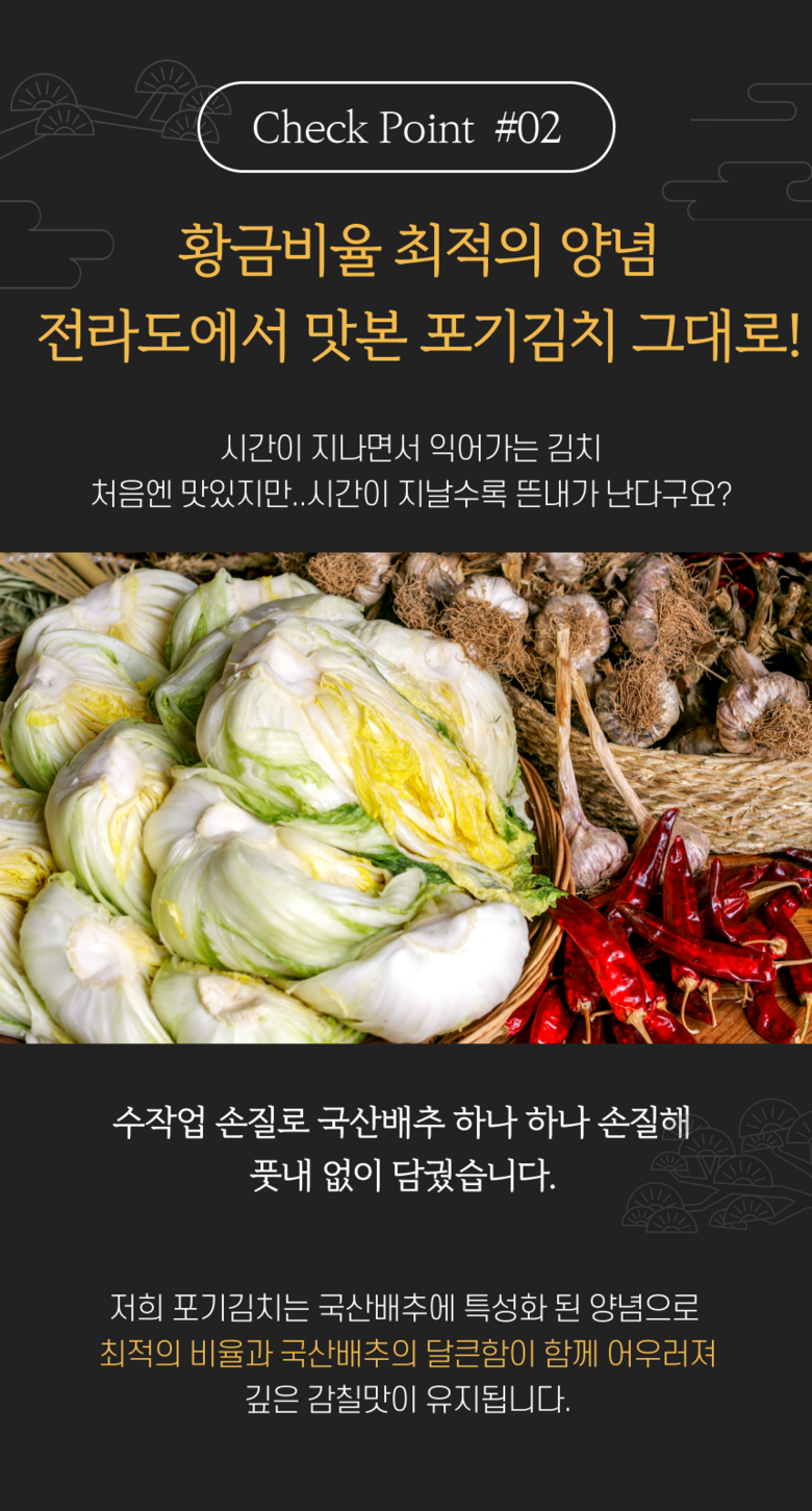 | 제품명 | 100% 국산 배추/양념 사용 전라도식 포기김치 배추김치 | 식품의 유형 | 포기김치,배추김치 |
