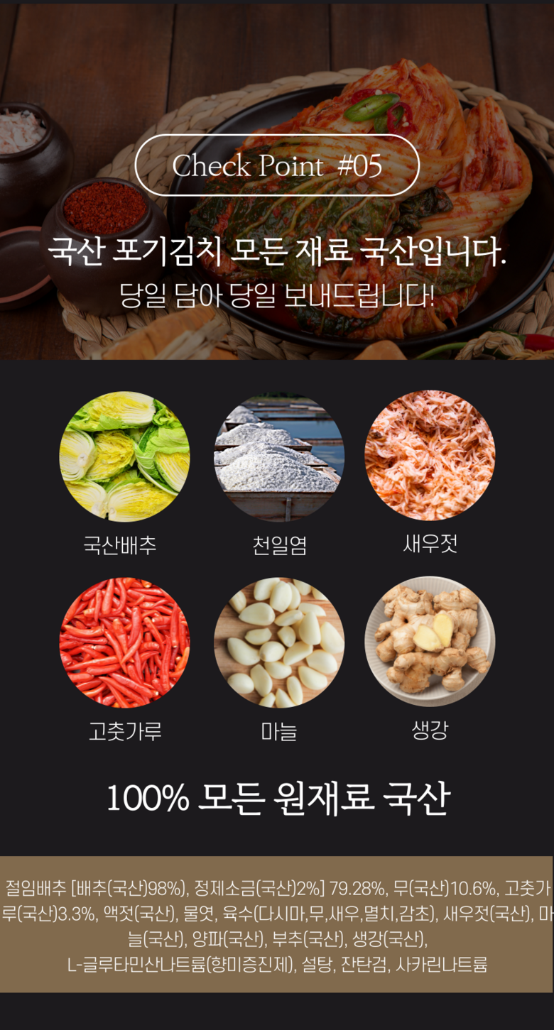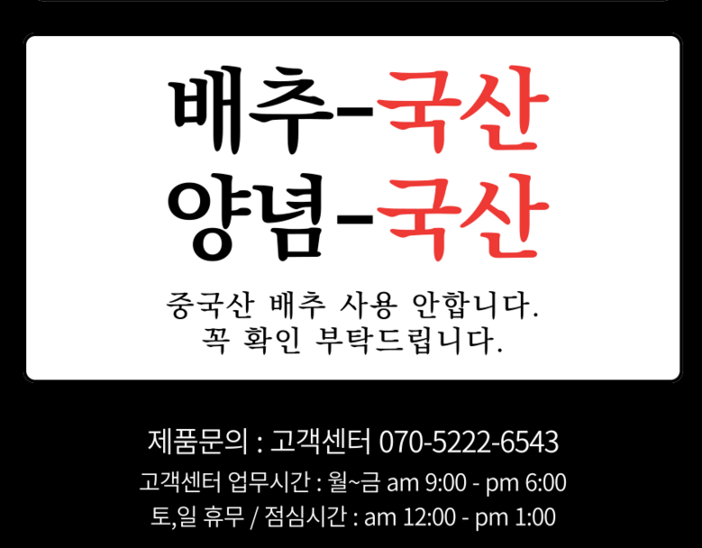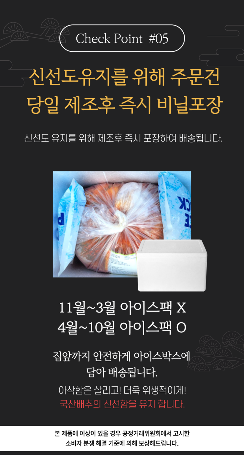 | 포장단위별 내용물의 용량(중량), 수량 | 5kg, 10kg | 원재료명 및 함량 | 절임배추[배추(국산)98%), 정제소금(국산)2%] 79.28%, 무(국산)10.6%, 고춧가루(국산)3.3%, 액젓(국산), 물엿, 육수(다시마,무,새우,멸치,감초), 새우젓(국산), 마늘(국산), 양파(국산), 부추(국산), 생강(국산), L-글루타민산나트륨, 설탕, 잔탄검, 사카린나트륨, 품목제조번호: 2012043525219 |